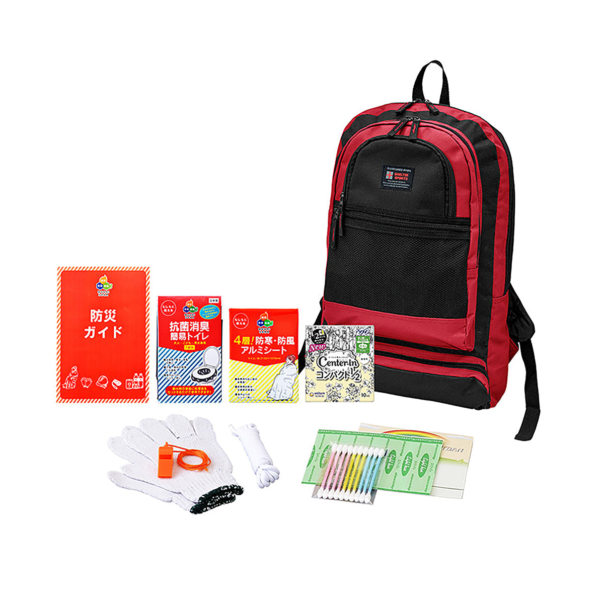 ①デイパッグ、②生理用品、③4層!防寒・防風アルミシート、④抗菌消臭・簡易トイレ、⑤防災ガイド、⑥絆創膏5枚、⑦綿棒10P、⑧軍手、⑨ロープ、⑩笛 |