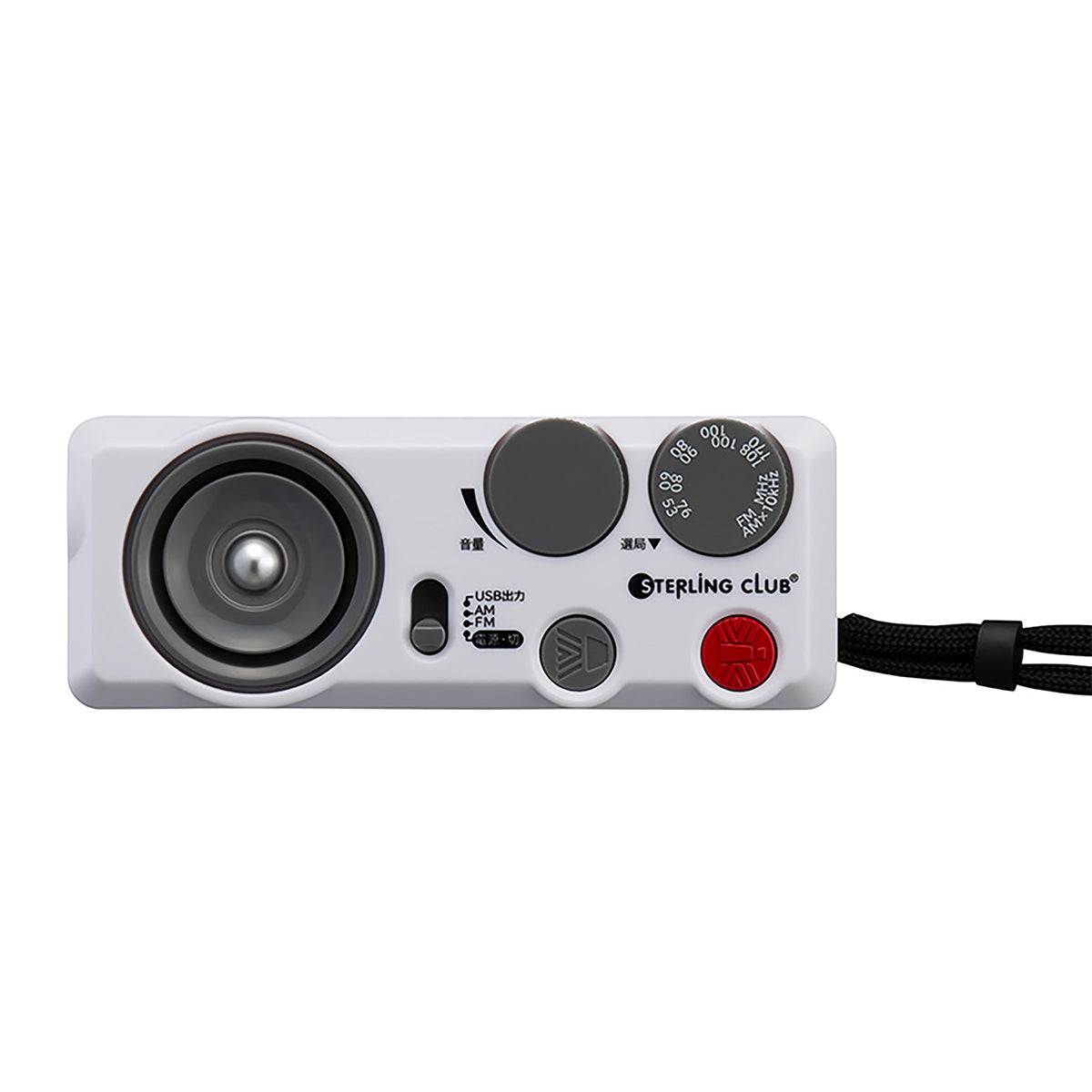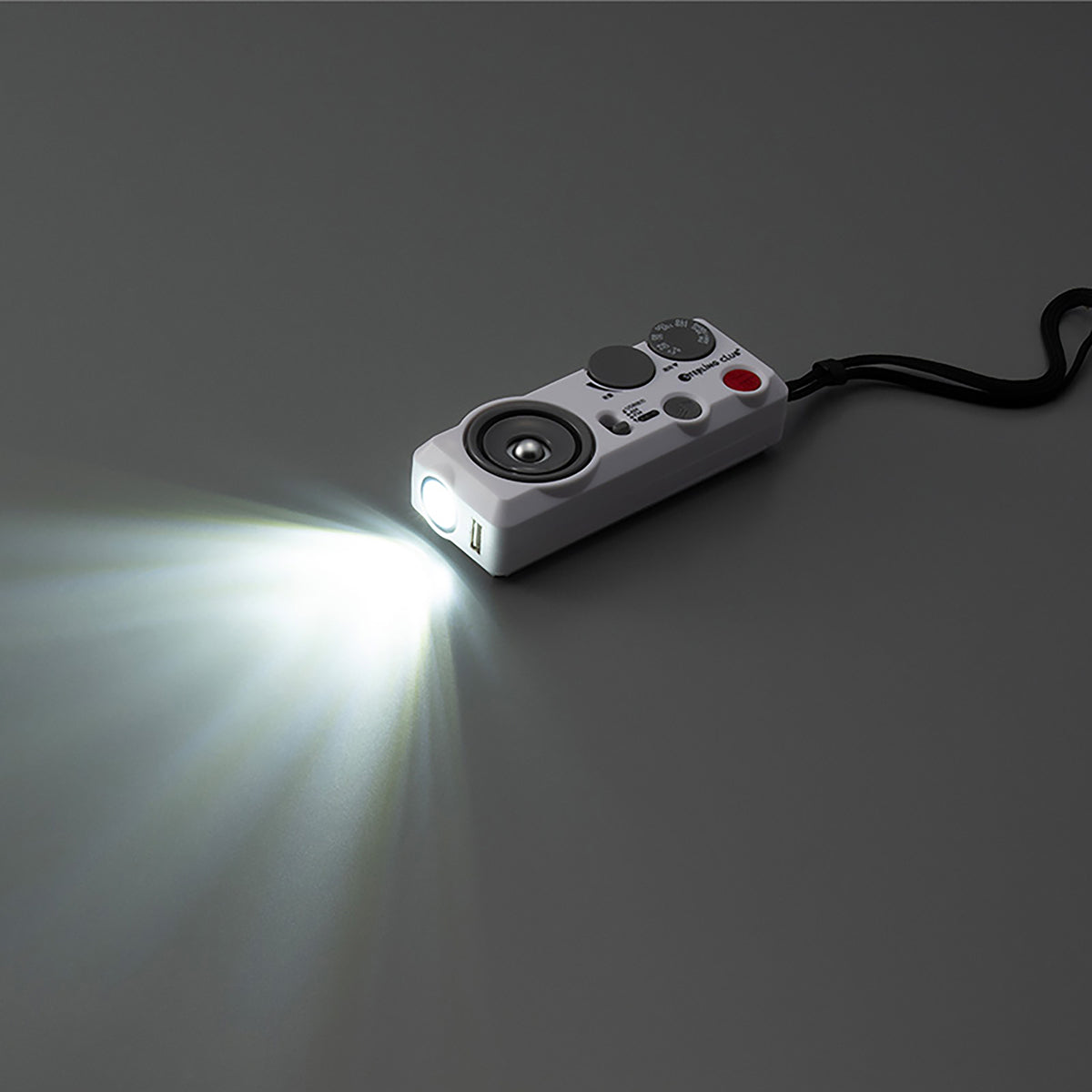 ①LEDライト(強/弱)、②サイレン(点滅灯連動)、③ラジオ(AM/ワイドFM)、④携帯電話充電機能、⑤イヤホンジャック |