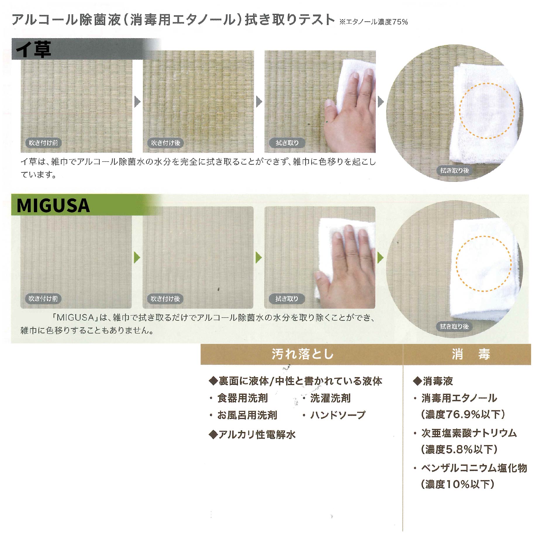 | 掃除後は、必ず固く絞ったタオルで表面をふき取って下さい。掃除の際に使用されるタオルの素材や拭き方によって傷がついたり、時間の経過によっては、完全に汚れが取れないこともあります。熱したヤカン、鍋、アイロン、煙草により、溶ける恐れがあります。殺虫剤、、灯油、ベビーオイル、ベンジン等は畳が膨潤する恐れがあります。消毒薬の濃度は適正濃度を確認しご使用ください。 |