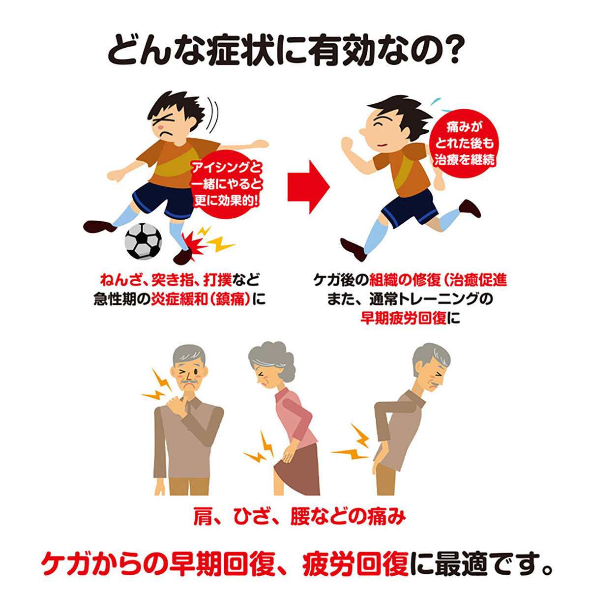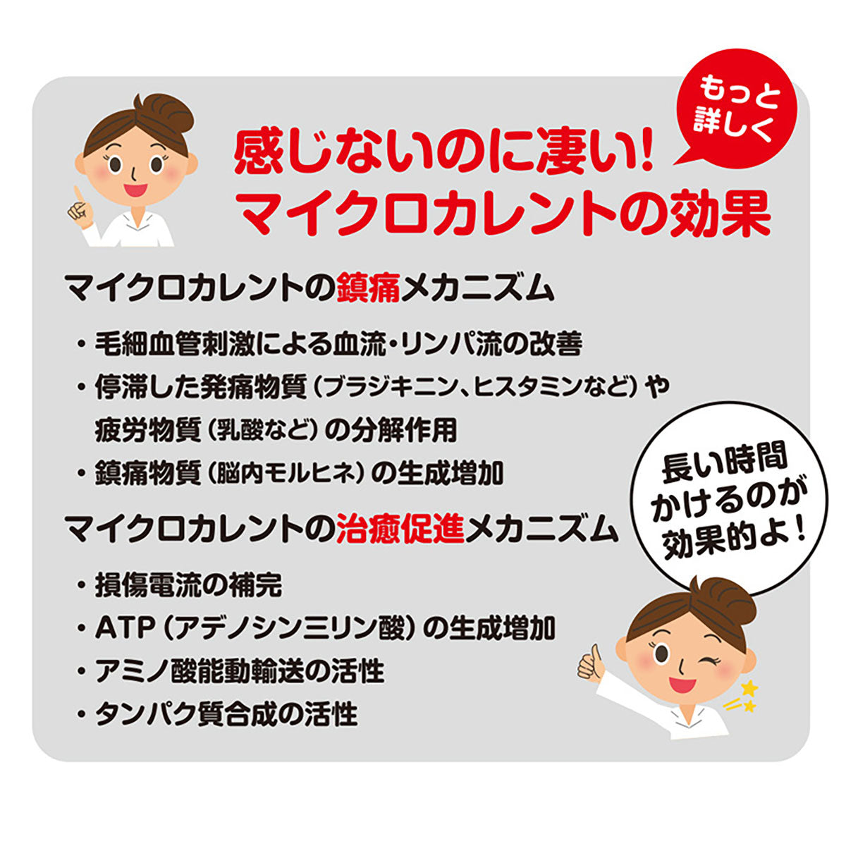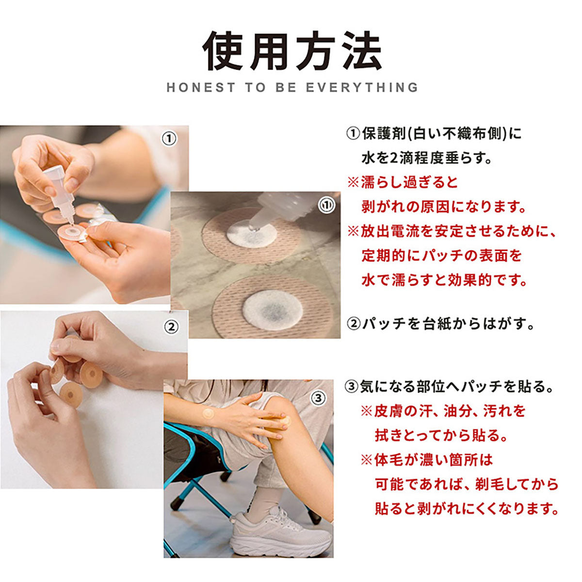 1.付属のミニボトルに水を入れます。2.(台紙からはがさない状態で)パッチ裏面の不織布(白い箇所)に水を2~3滴垂らして濡らします。3.台紙から剥がして、患部に貼ってください。※ 放出電流を安定させるために、定期的にパッチの表面を水で濡らしてください。 |