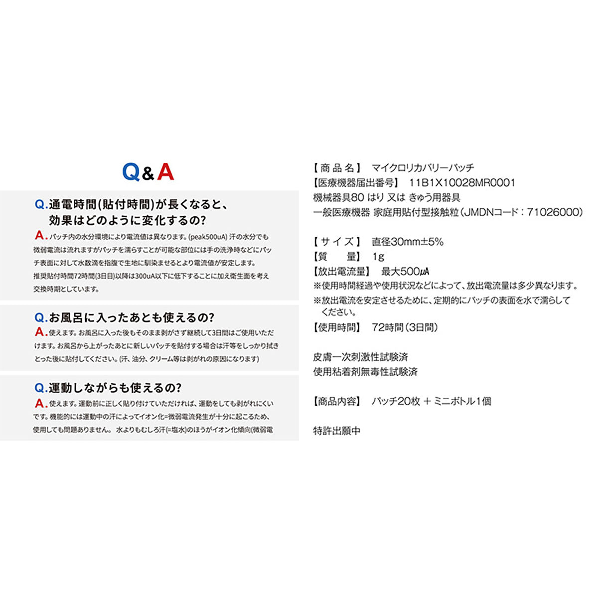 マイクロリカバリーパッチ 20枚入 生体電流 整う 筋肉 関節 こり解消 疲労回復