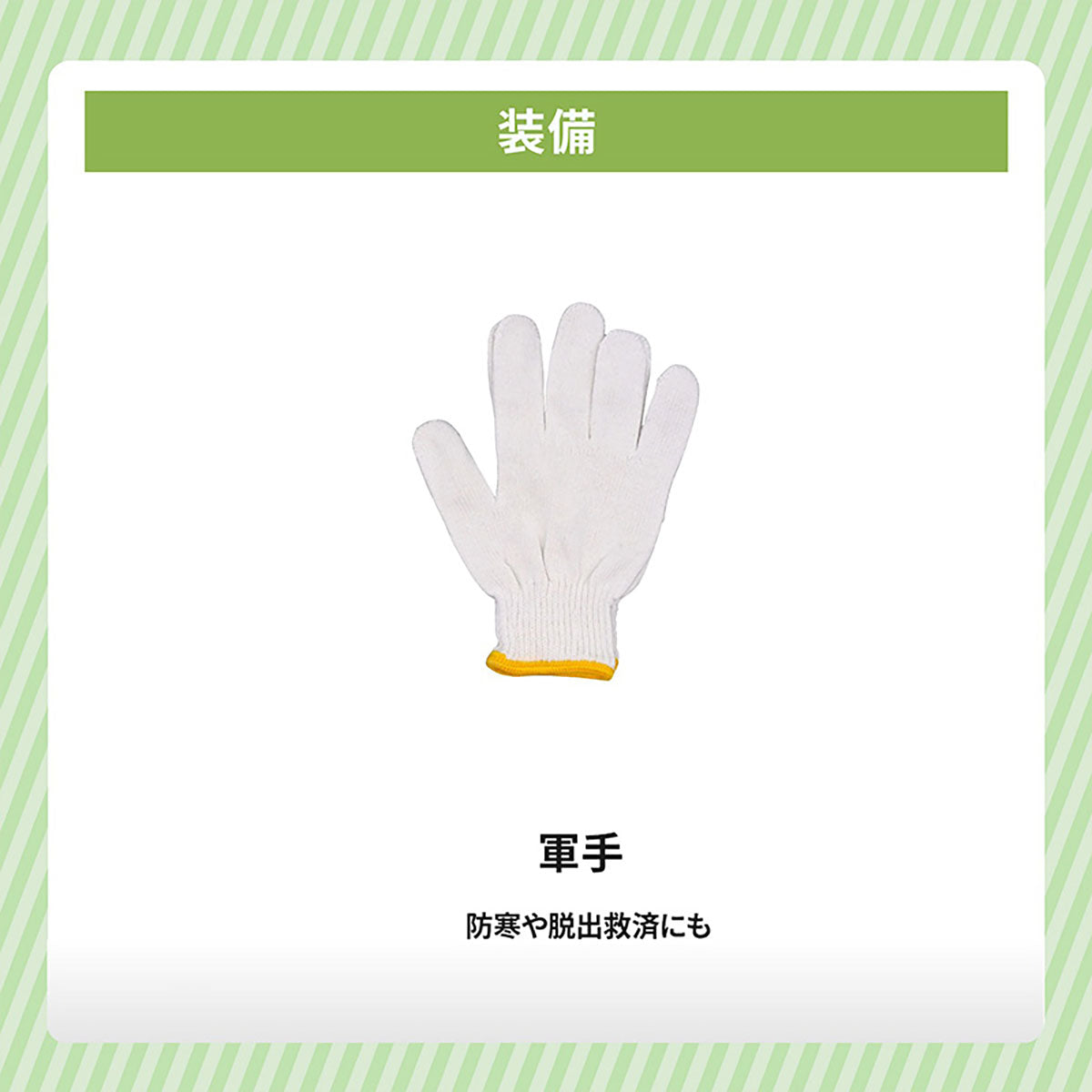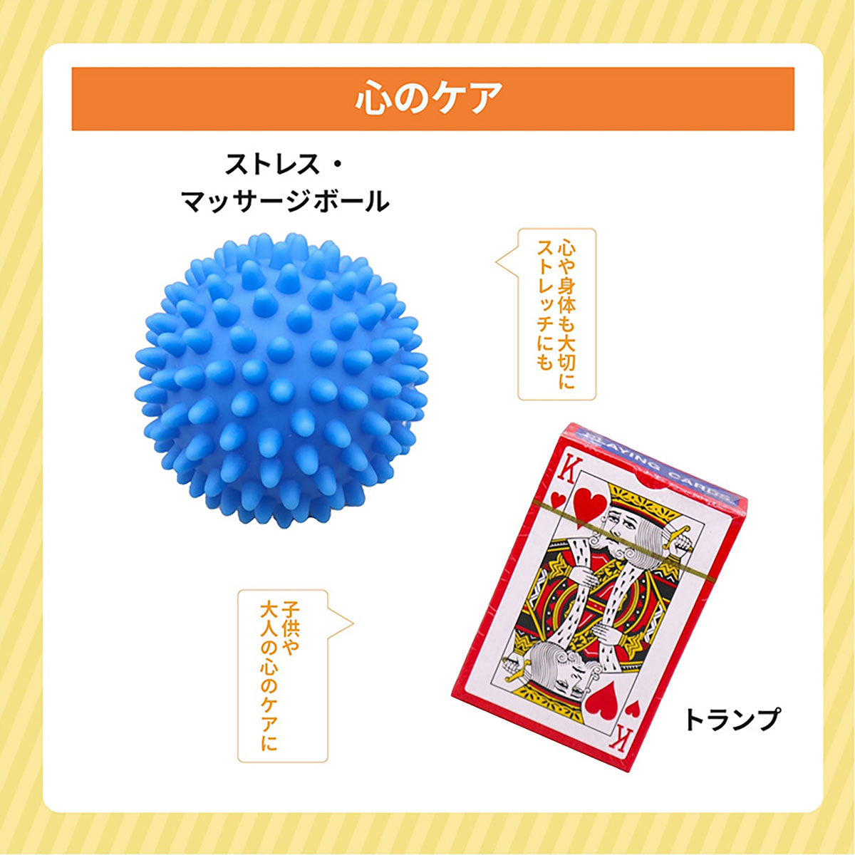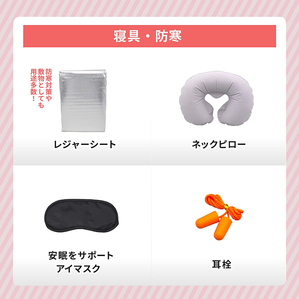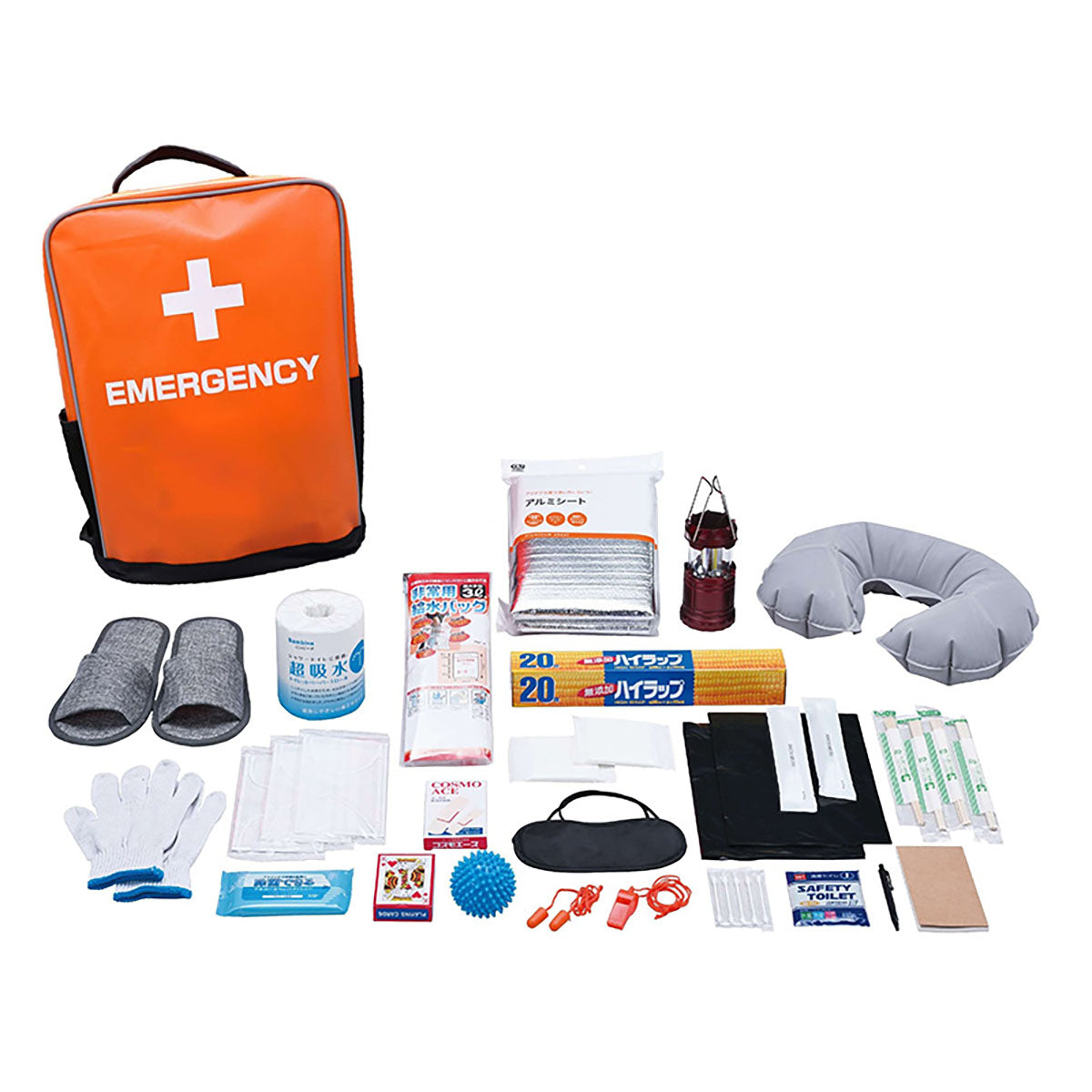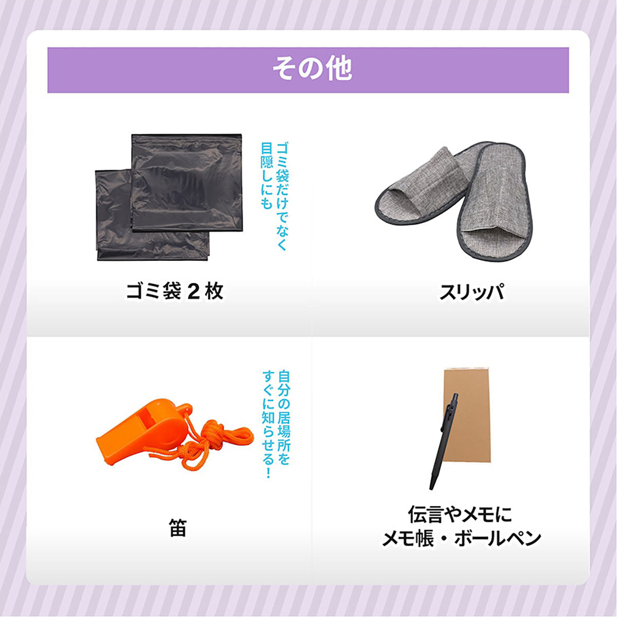 ・絆創膏・マスク3枚・綿棒5本・歯ブラシ2本・簡易トイレ×1・トイレットペーパー1R・ウェットティッシュ・生理用品・レジャーシート・アイマスク・耳栓・ネックピロー・ラップ・割りばし4本・タンク・ストレス・マッサージボール・トランプ・笛・スリッパ・メモ帳・ボールペン・ゴミ袋2枚・軍手・リュック・ミニスライドランタン(単四乾電池3本使用・別売) |
