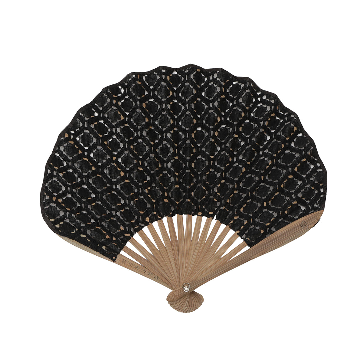 立体感のある特徴的なラッセルレース、オプティカルな柄でエレガントな印象が魅力的な扇子です。