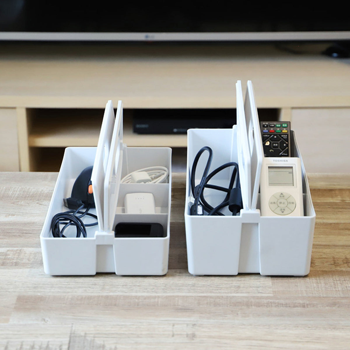 片側仕切り付きで文房具屋コスメなど細かいものの仕分けも簡単で見やすいです。