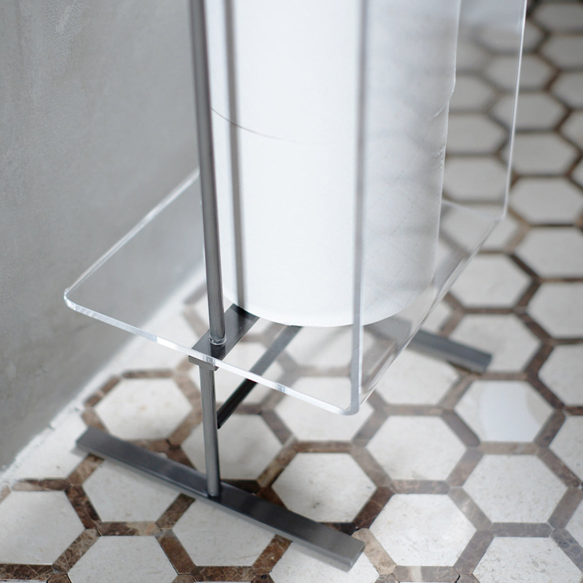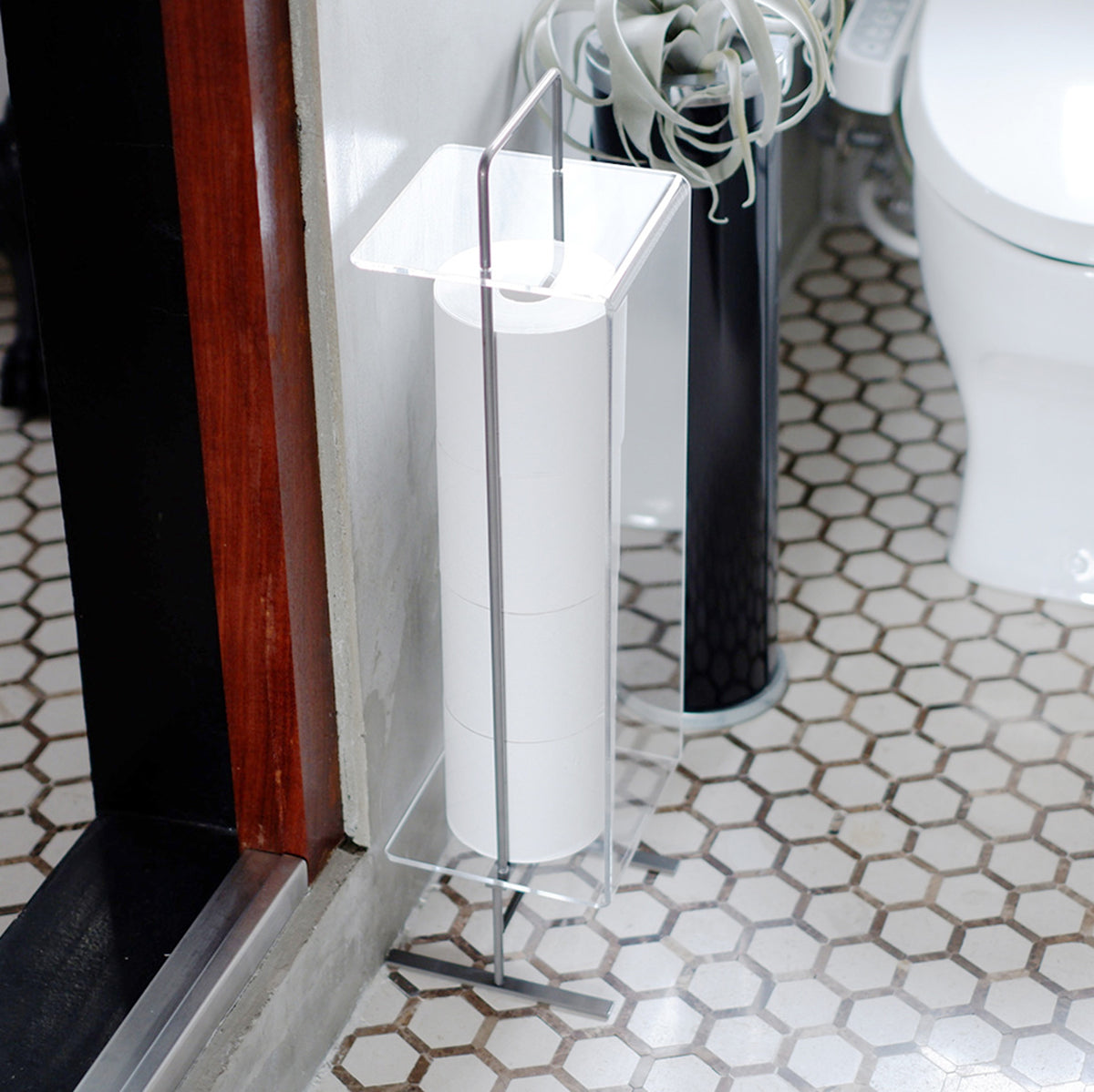 アクリルカバー付ワイヤー トイレットペーパースタンドは、透明感のあるアクリルとニュアンスのある鉄の組み合わせが新鮮なデザイン性と機能性を兼ね備えたトイレットペーパースタンドです。