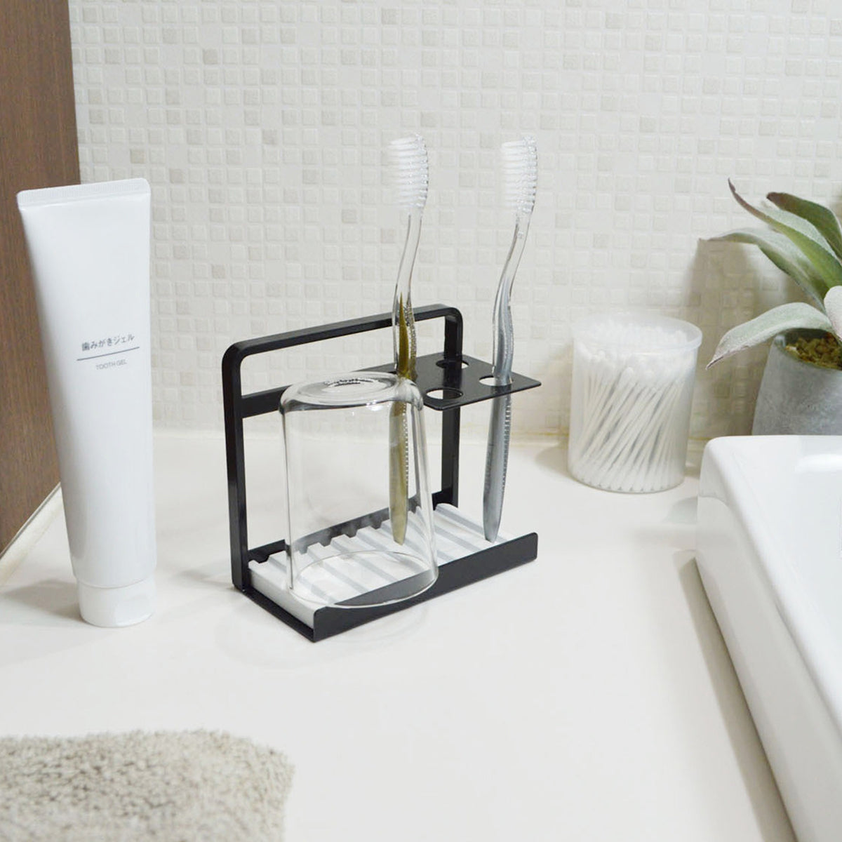 4本の歯ブラシを立てることができ、コップや歯磨き粉を置くスペースもあります。