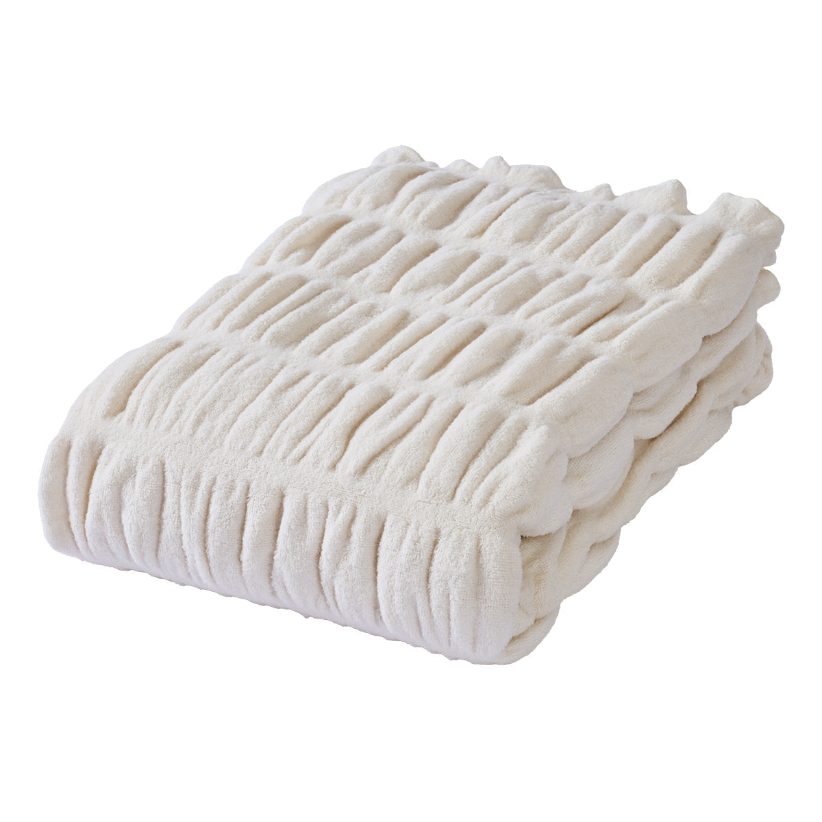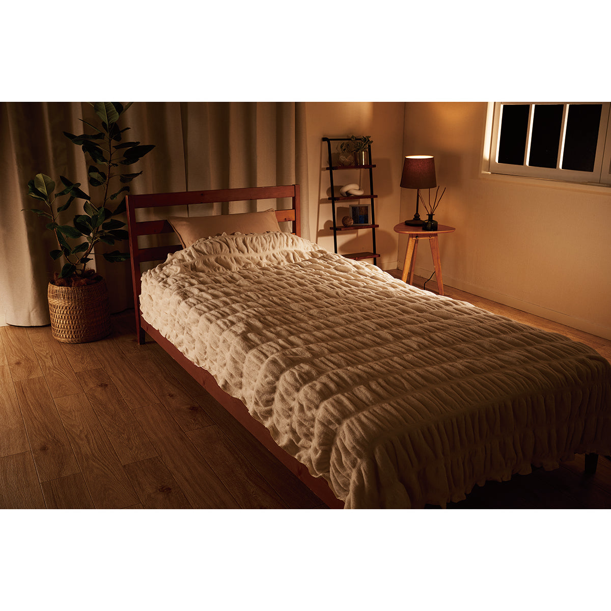 hug warm 掛け毛布は、特許のくしゅくしゅ加工を施すことで、ふっくらふわくしゅ生地と身体の間に空気層ができ、たっぷりと暖かい空気をため込むので保温性抜群の毛布です。暖かいのに蒸れにくくふわふわ柔らかく体にフィットします。糸を絶妙なバランスで編んでいるので、保温性もありながら通気性も優れています。睡眠中の汗を逃してくれるので、ムレにくく朝まで快適に使えます。洗濯機(ネット使用)で洗うことが可能なので清潔に保てます。