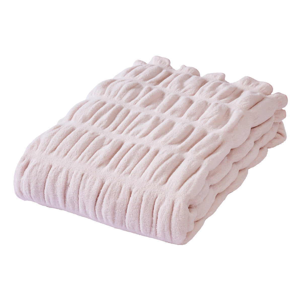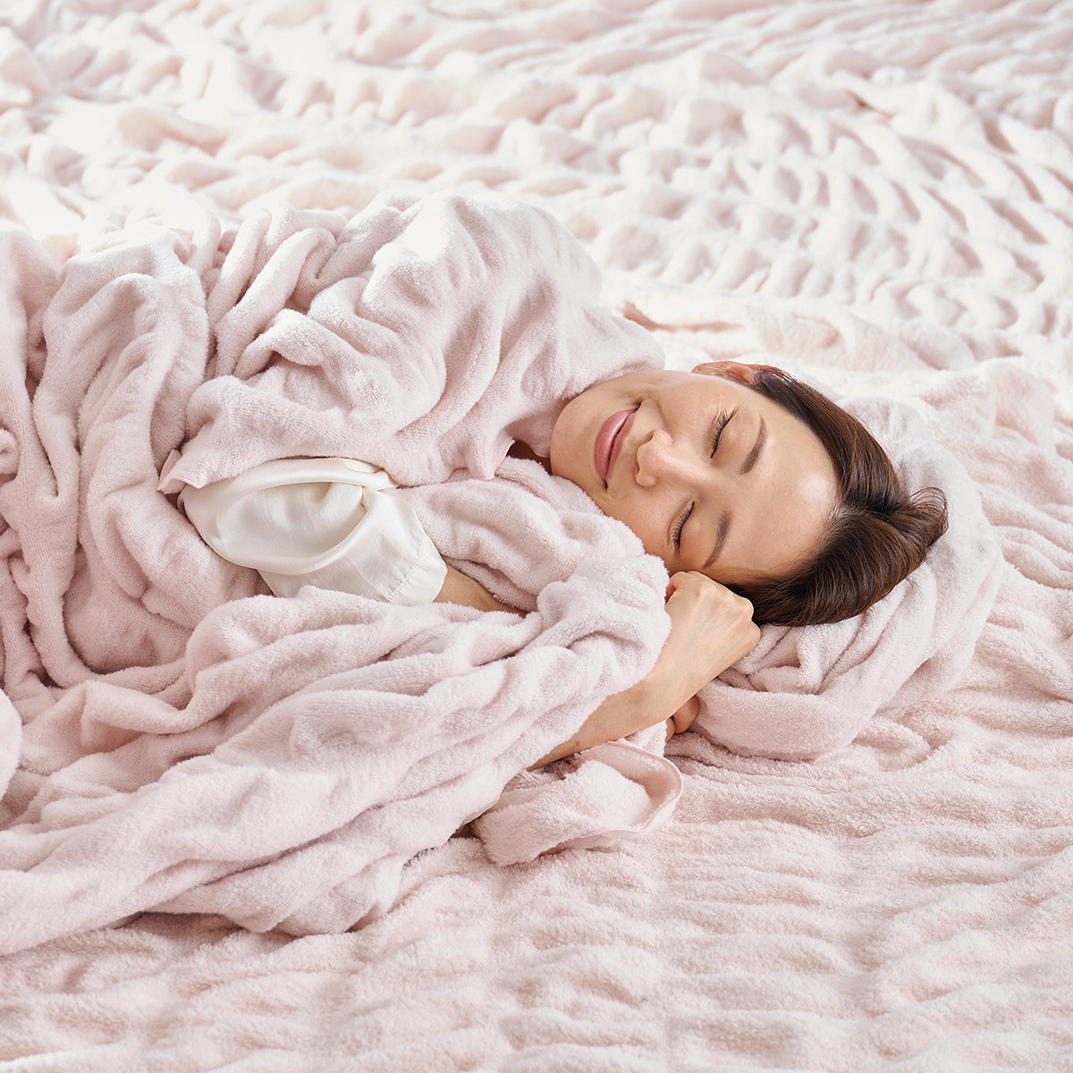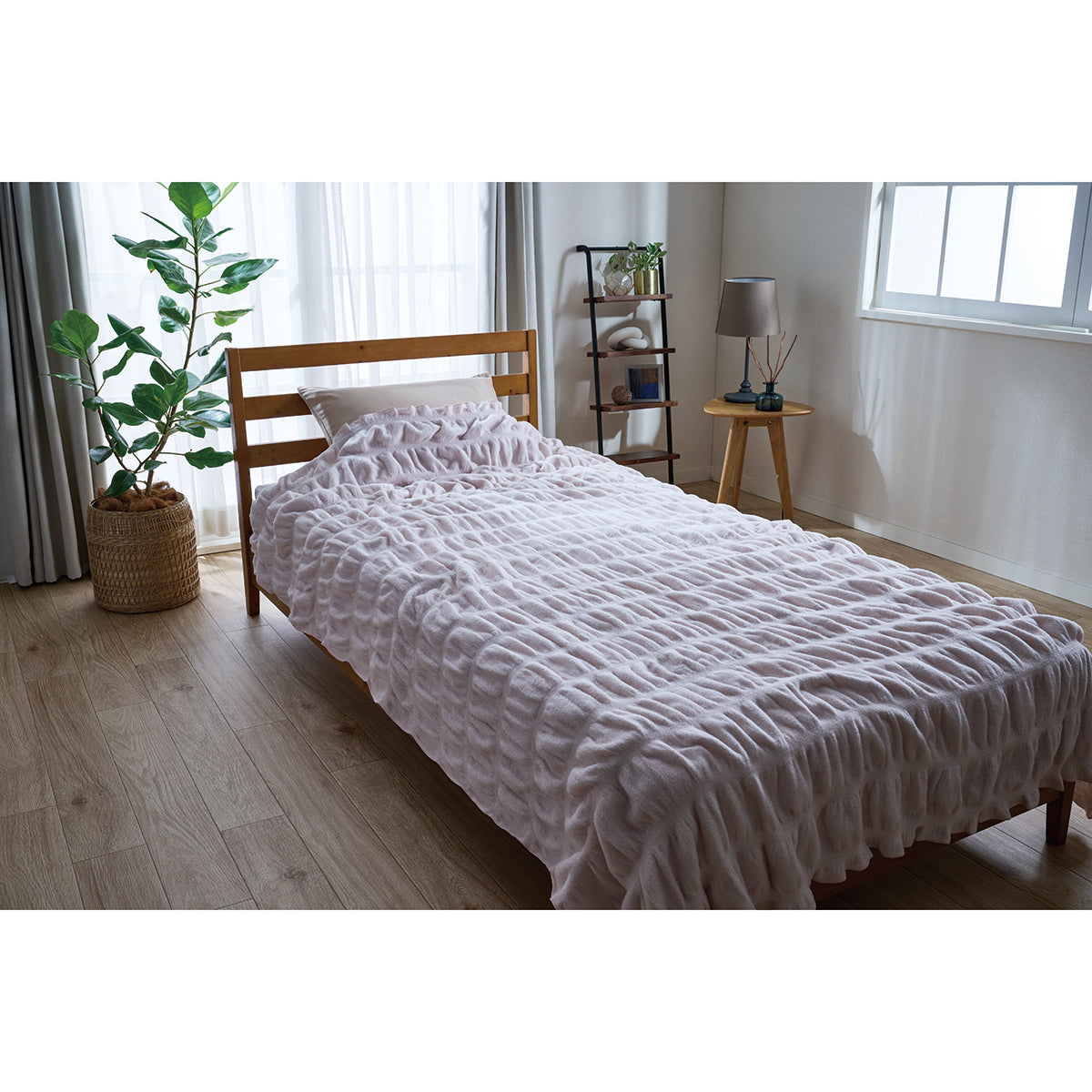 hug warm 掛け毛布は、特許のくしゅくしゅ加工を施すことで、ふっくらふわくしゅ生地と身体の間に空気層ができ、たっぷりと暖かい空気をため込むので保温性抜群の毛布です。暖かいのに蒸れにくくふわふわ柔らかく体にフィットします。糸を絶妙なバランスで編んでいるので、保温性もありながら通気性も優れています。睡眠中の汗を逃してくれるので、ムレにくく朝まで快適に使えます。洗濯機(ネット使用)で洗うことが可能なので清潔に保てます。