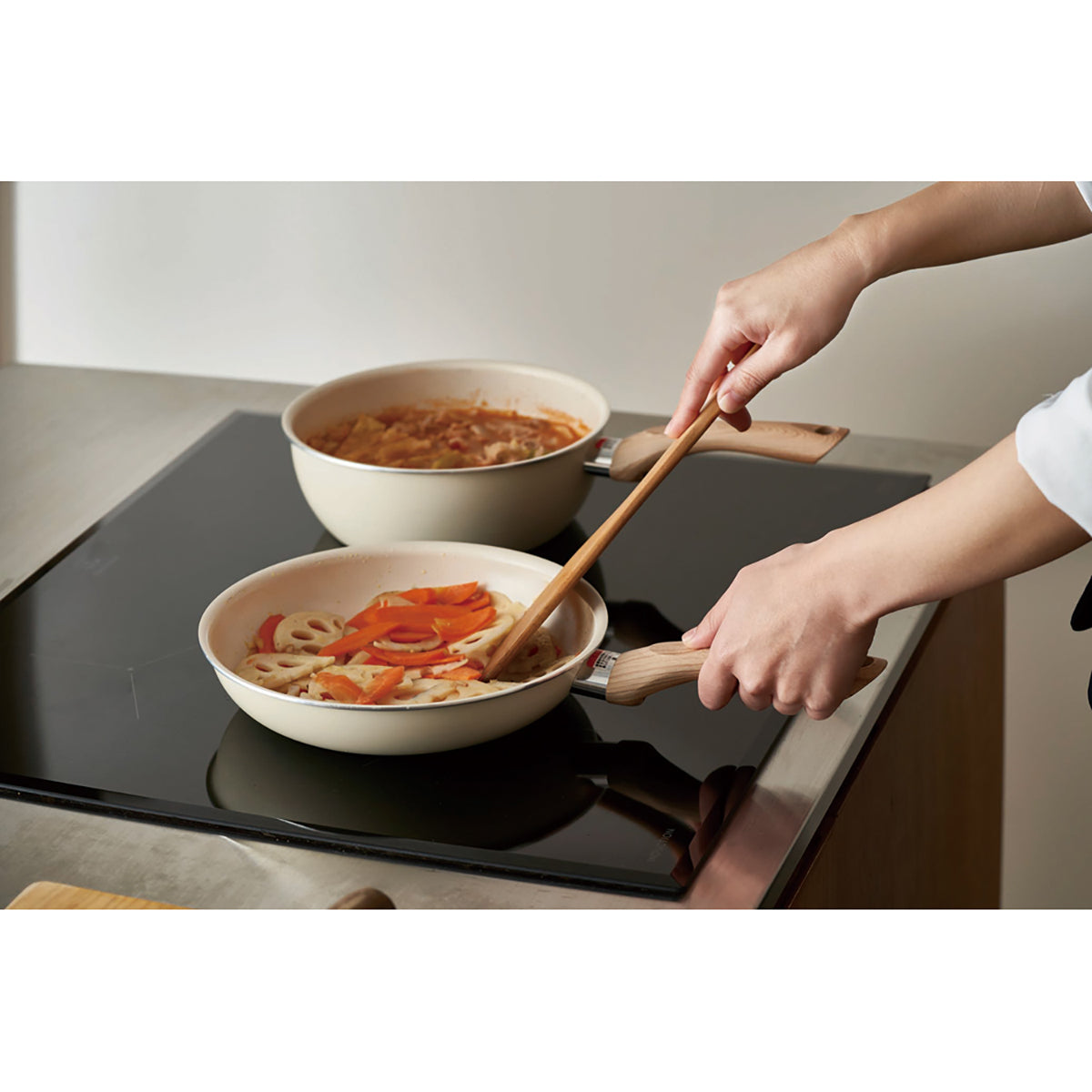 (表面加工)内面:セラミック塗膜加工、外面:焼付塗装、(本体)アルミ:底の厚さ2.3mm、はり底:ステンレス鋼(クロム18%)、取手:フェノール樹脂(木目調転写) |