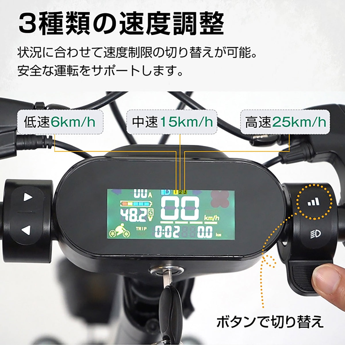 低速6km/h、中速15km/h、高速25km/h、制限解除35km/h(最高速度:約35km/h) |