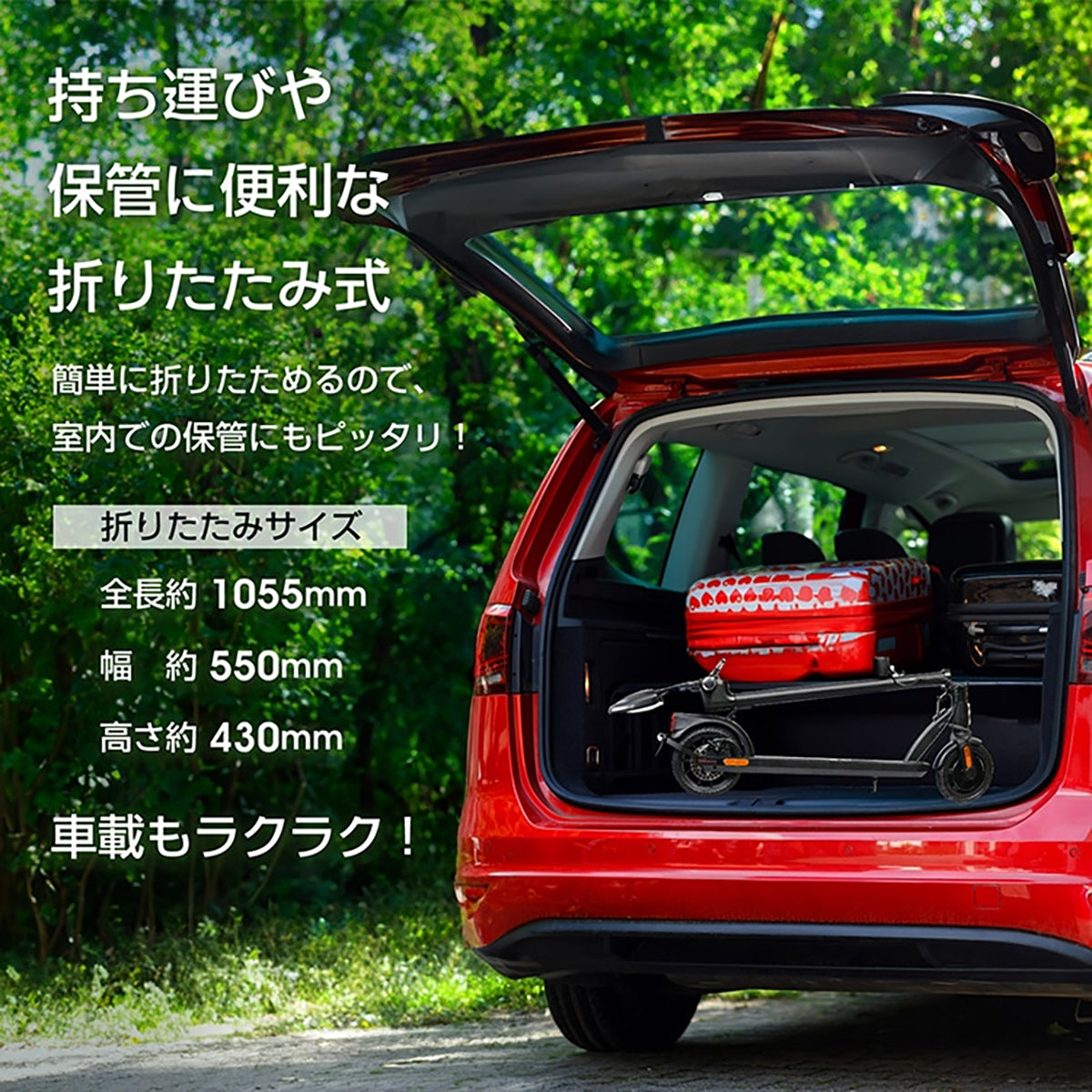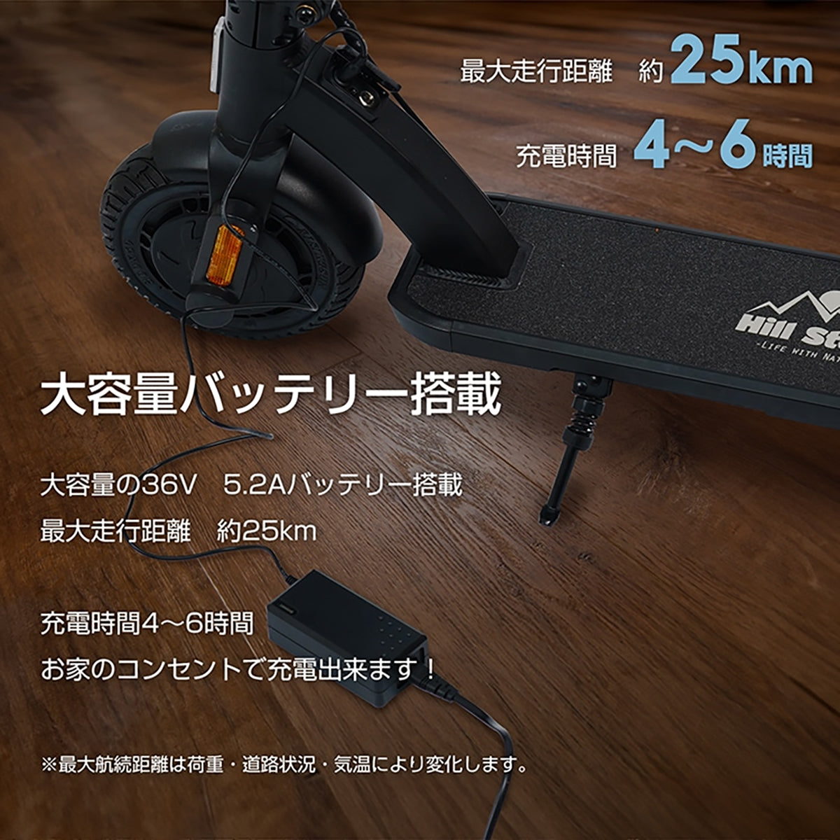 8インチノーパンクタイヤと幅広デッキで雨でも滑りにくく安定走行を実現しました。
