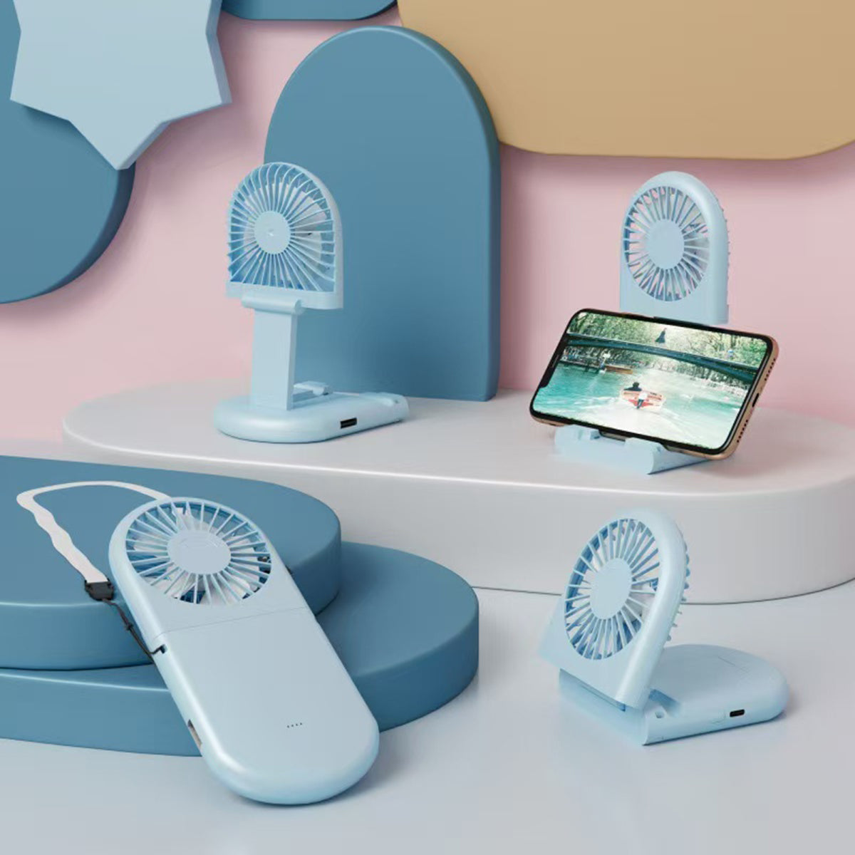 コロンとした丸いフォルムがかわいらしい、スマホスタンドにもなる折りたたみ式のハンディファン。