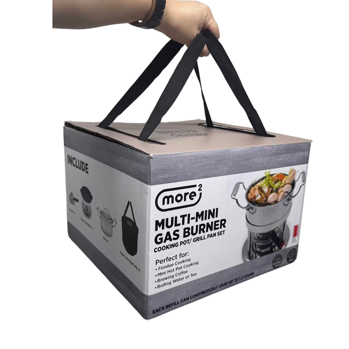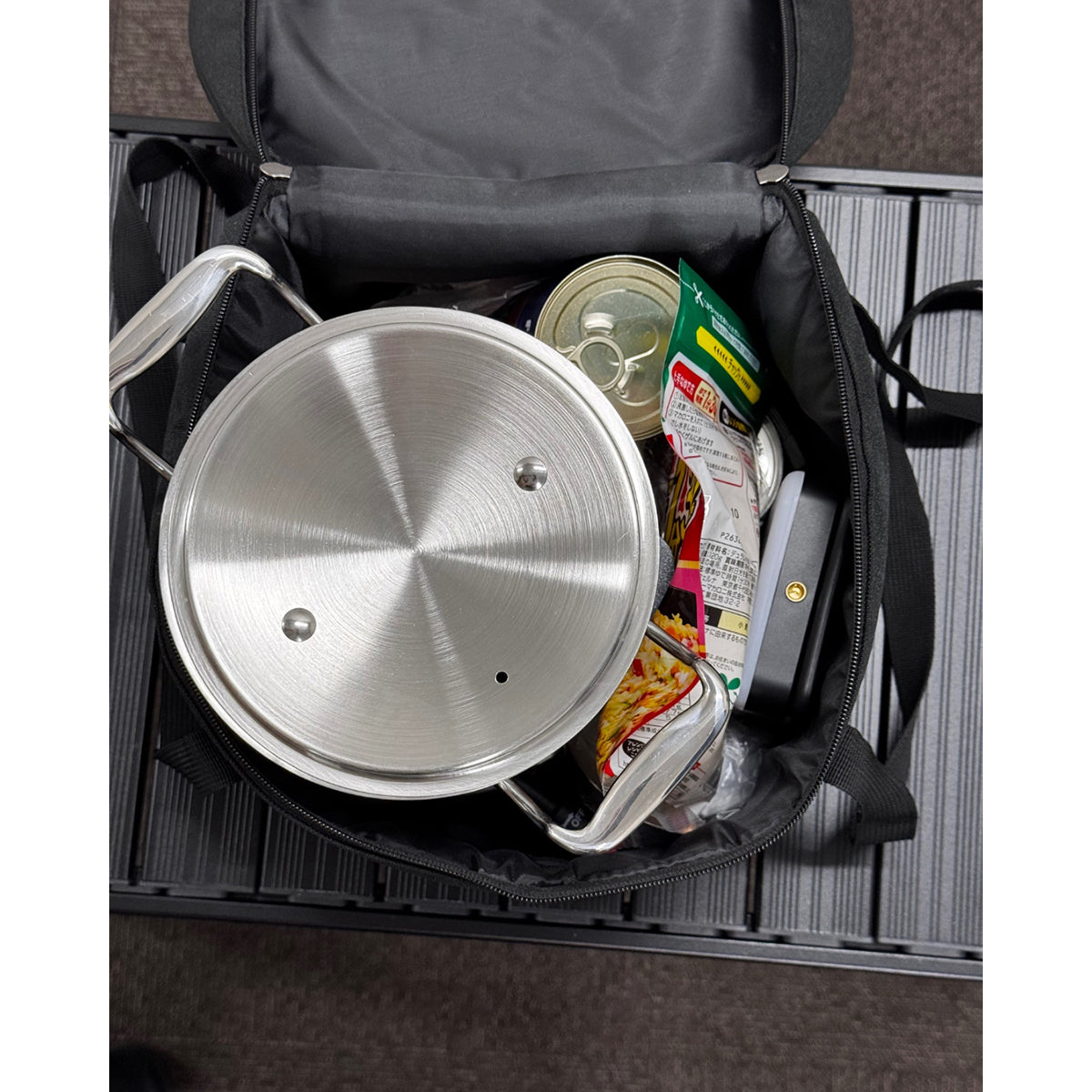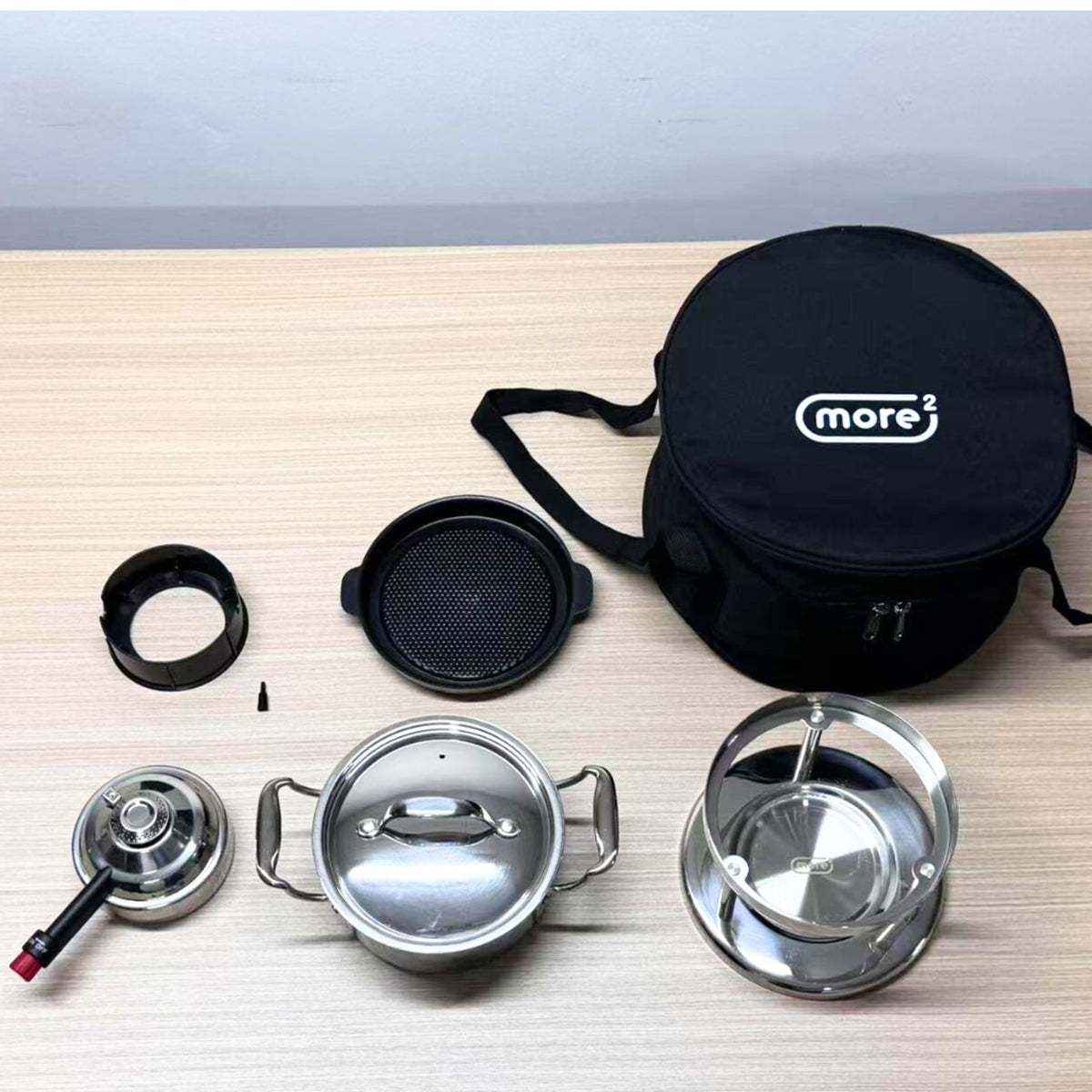 ミニガスバーナー、スタンド、ステンレス鍋、ステンレスパン(フッ素加工)、ガス充填ノズル・スタンド、収納バッグ |