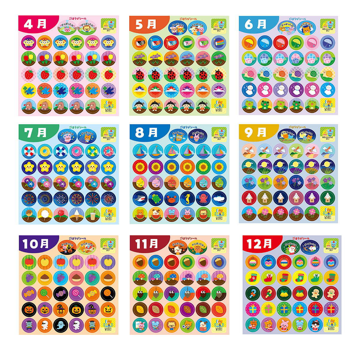 季節に合わせた可愛い絵柄で、出席、行事、ごほうびのシールがあります。