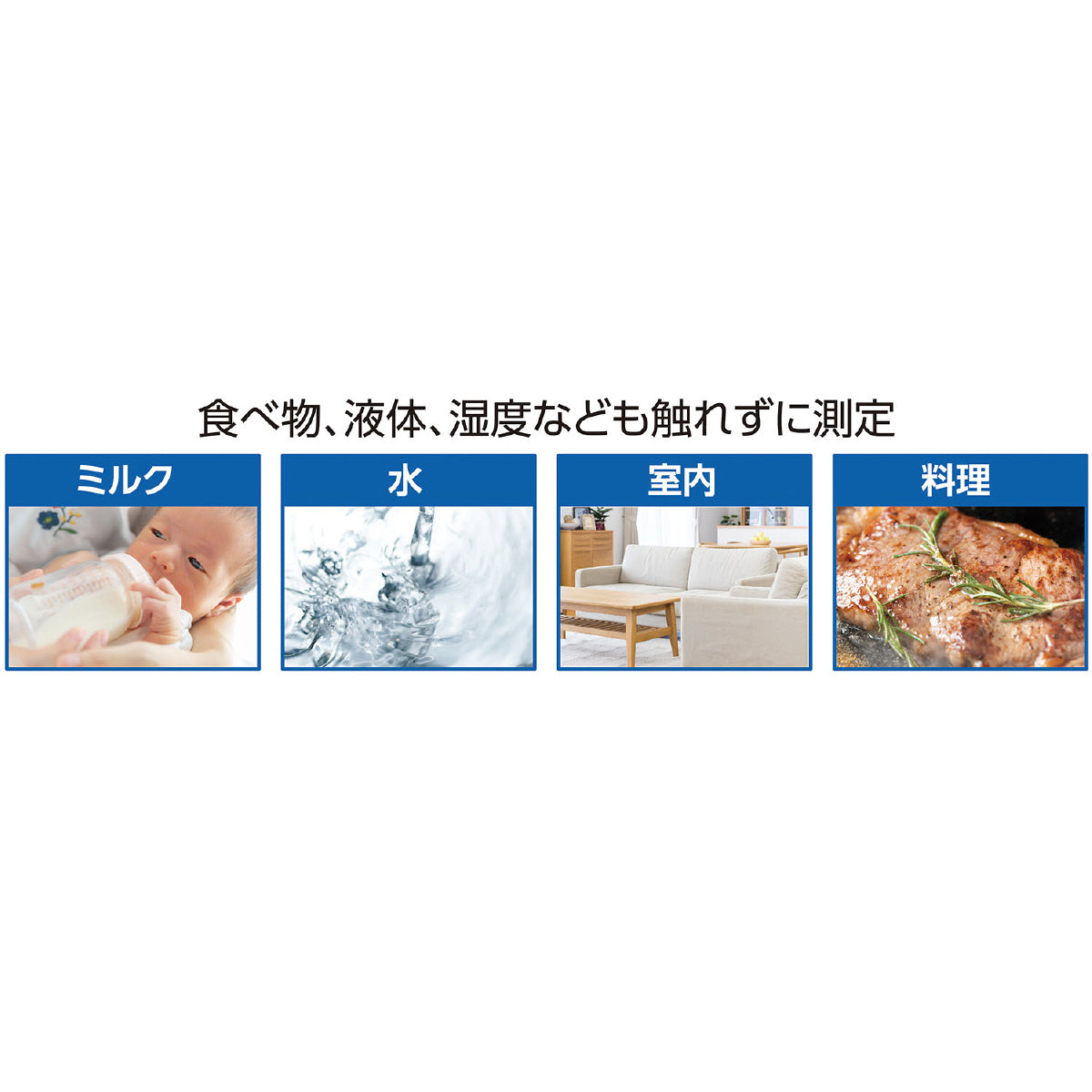 食べ物、液体、湿度なども触れずに測定できます。