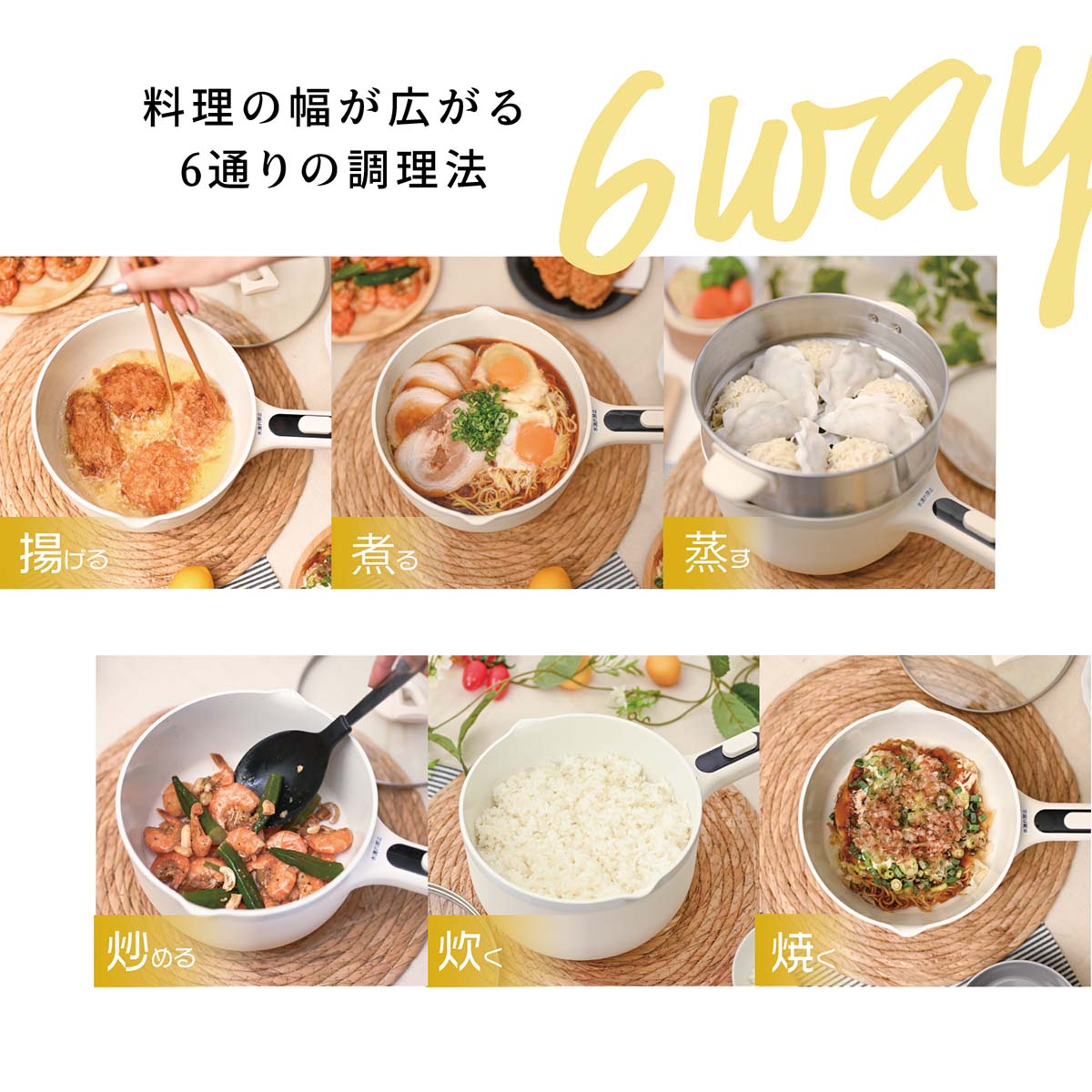 1台で6役:煮る、焼く、蒸す、揚げる、炒める、炊くなど様々な料理が楽しめる容量2Lの電気鍋(グレー)です。