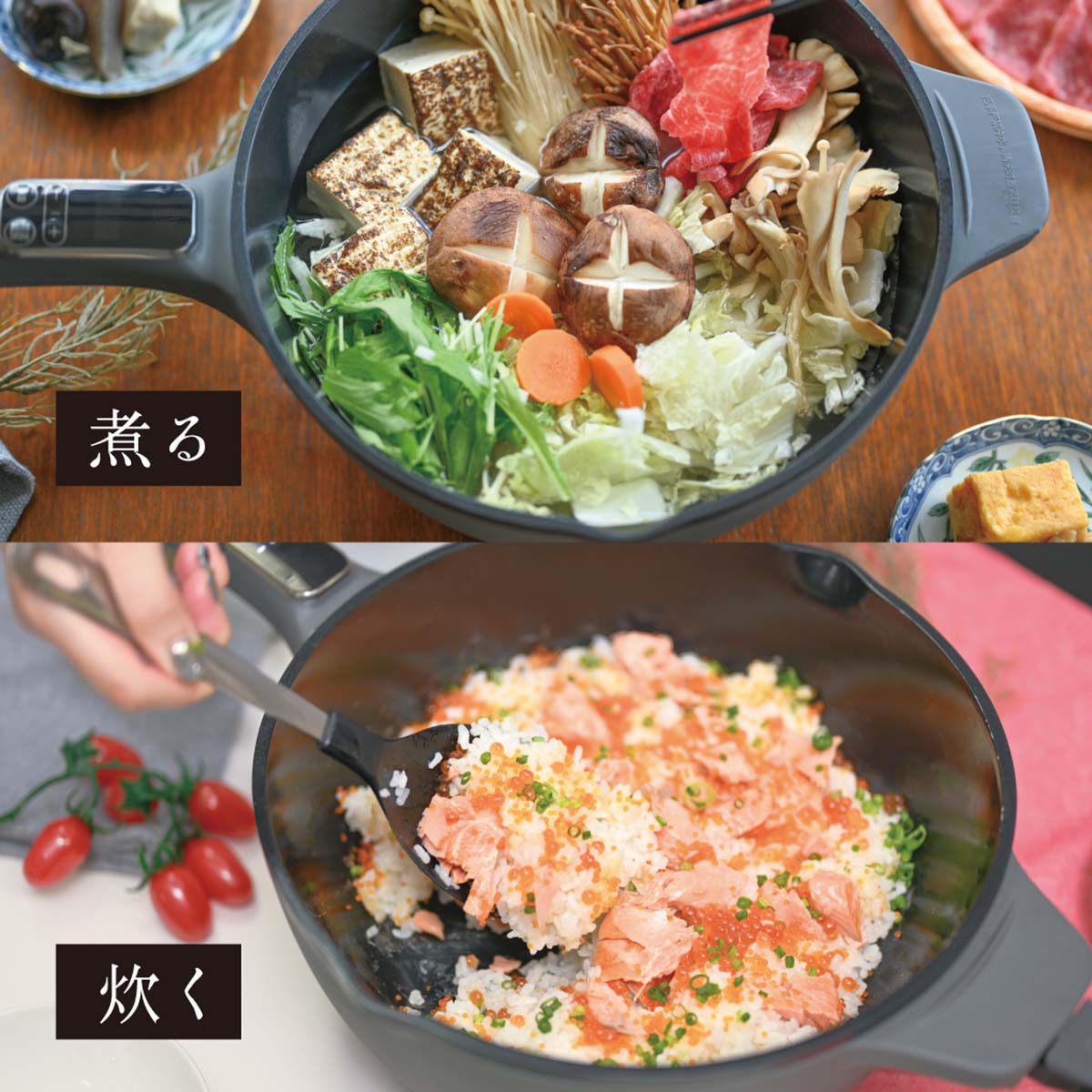 1台で6役:煮る、焼く、蒸す、揚げる、炒める、炊くなど様々な料理が楽しめる容量4Lの電気鍋(ダーククレー)です。