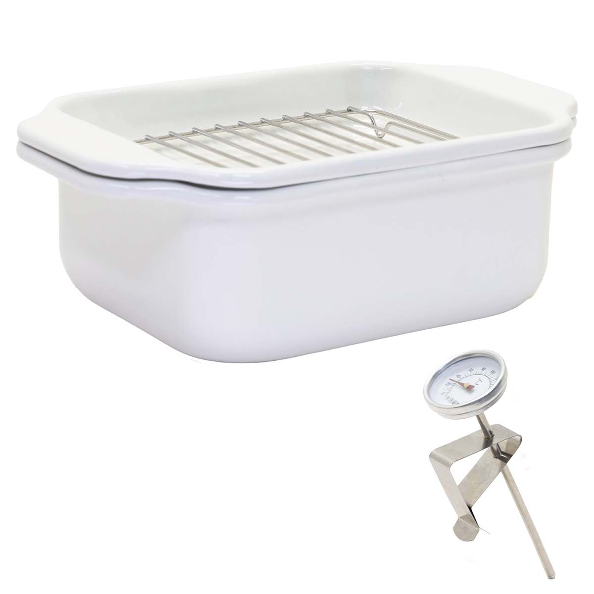 バット、すのこ網、温度計付きのホーロー天ぷら鍋です。