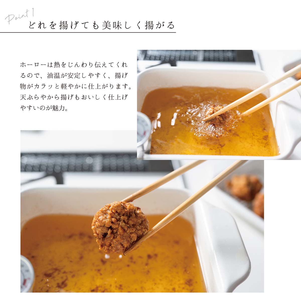 ホーローは熱をじんわり伝えてくれるので、油温が安定しやすく、揚げ物がカラッと軽やかに仕上がります。
