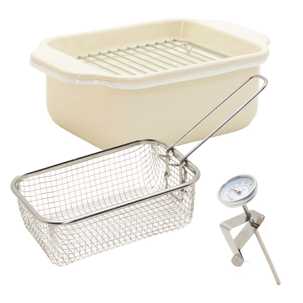 バット、すのこ網、温度計付きのホーロー天ぷら鍋と揚げざるのセットです。
