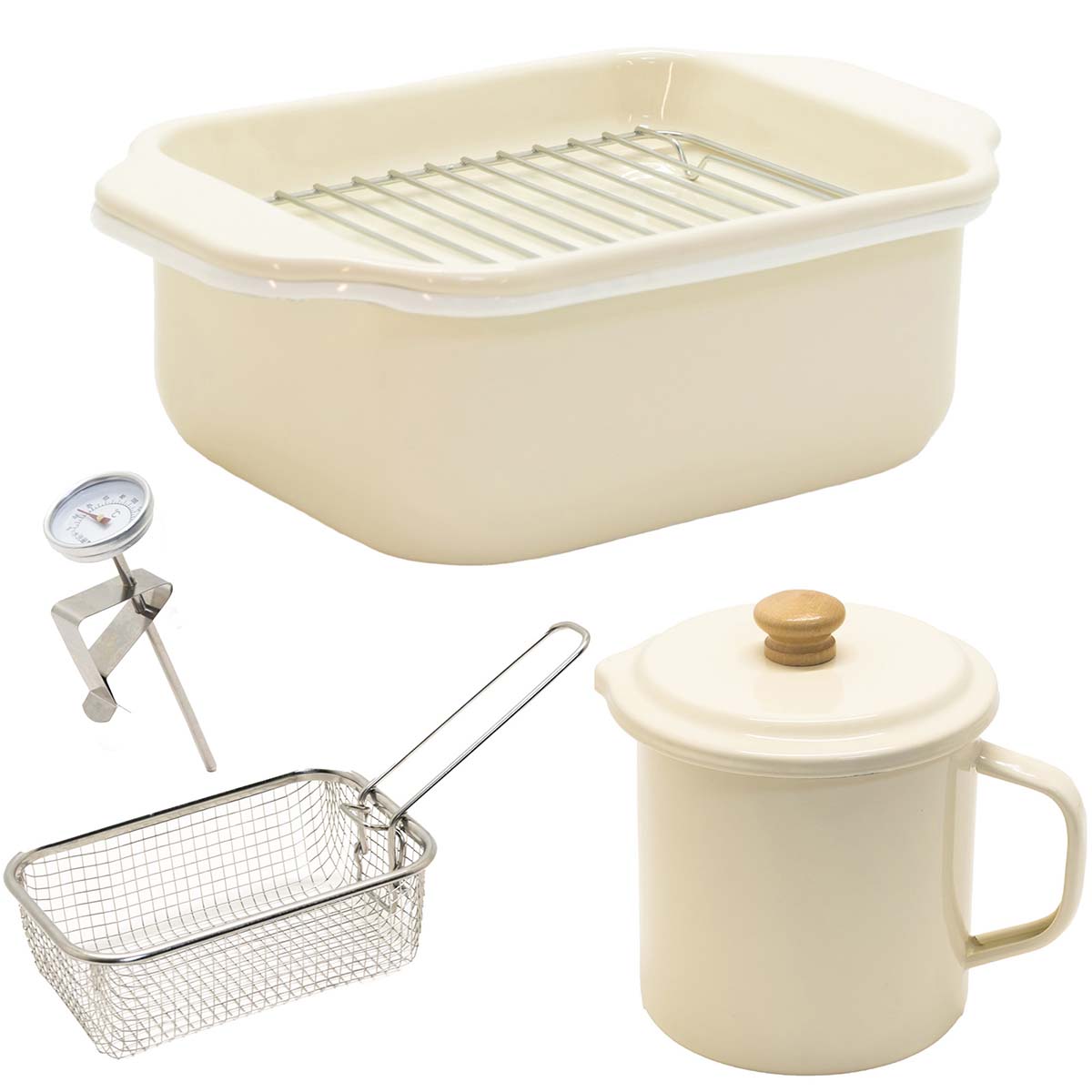 バット、すのこ網、温度計付きのホーロー天ぷら鍋と、揚げざる、オイルポットのセットです。