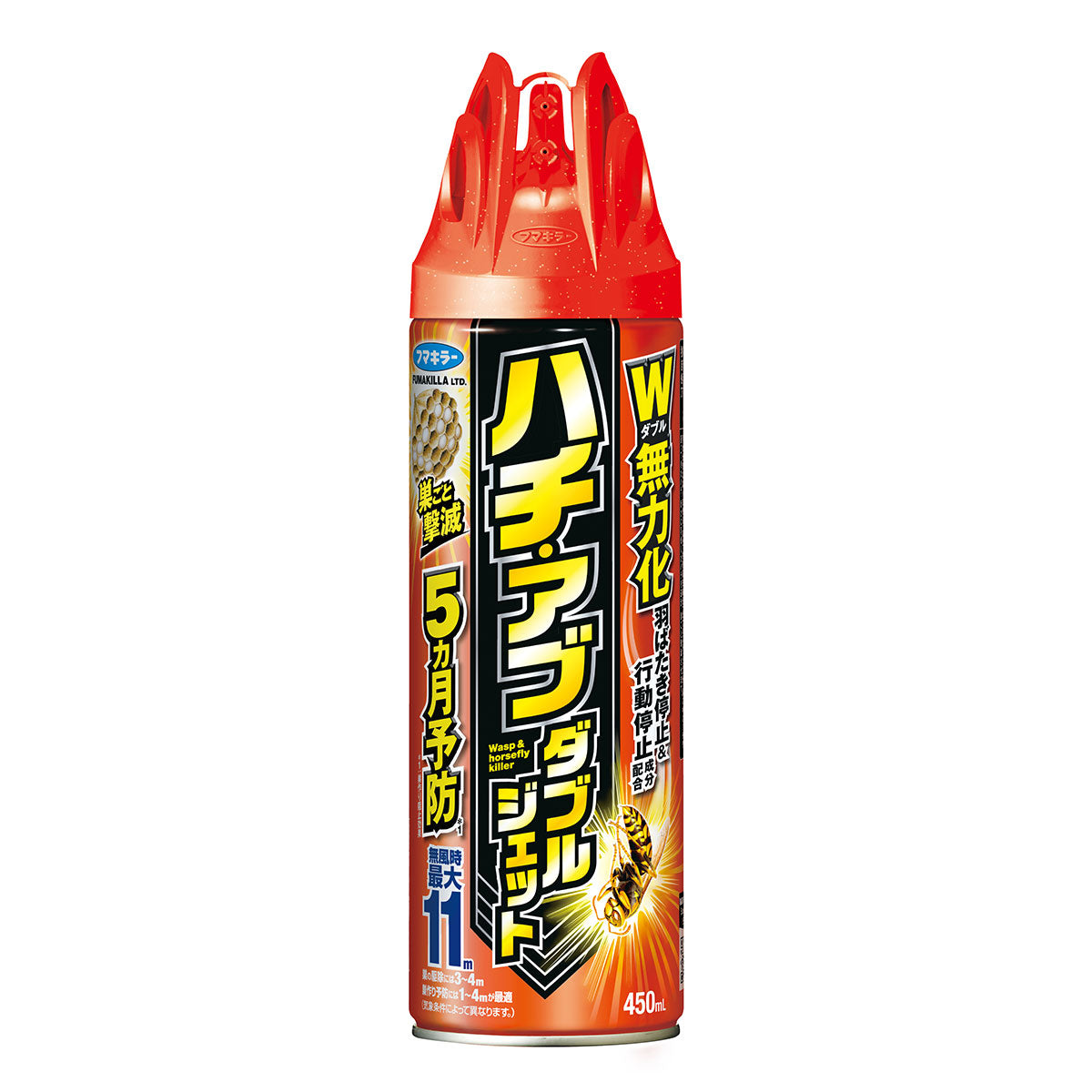 ハチ対策スプレーはジェット噴射で離れたハチや巣に直接噴射する事で殺虫可能です(最大約11m)。