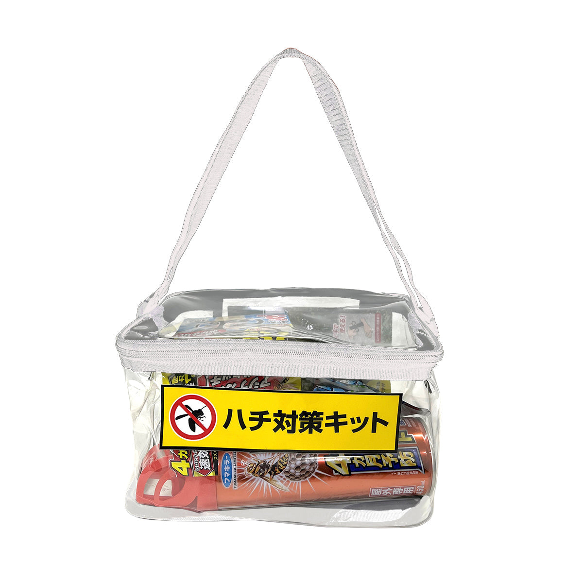 分かりやすい透明収納バッグの中にハチ対策に使用できる製品をまとめました。