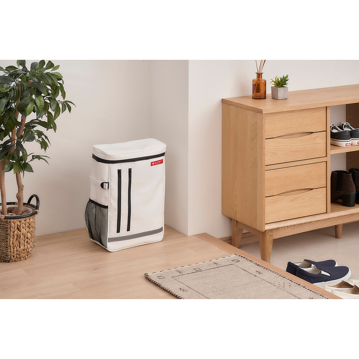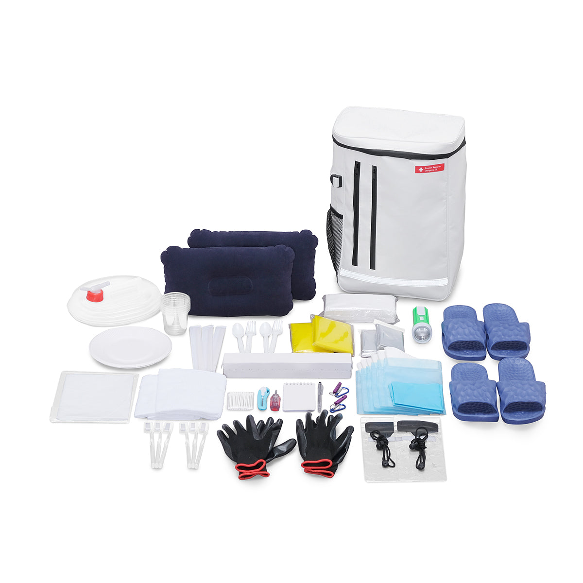 ・リュック ・ボディタオル×2枚 ・ポリ袋 ・EVAサンダル(26cm)×2足 ・ホイッスル×2個 ・筆記用具セット ・防水スマホ袋×2個 ・カッターナイフ ・2WAYドライバー |