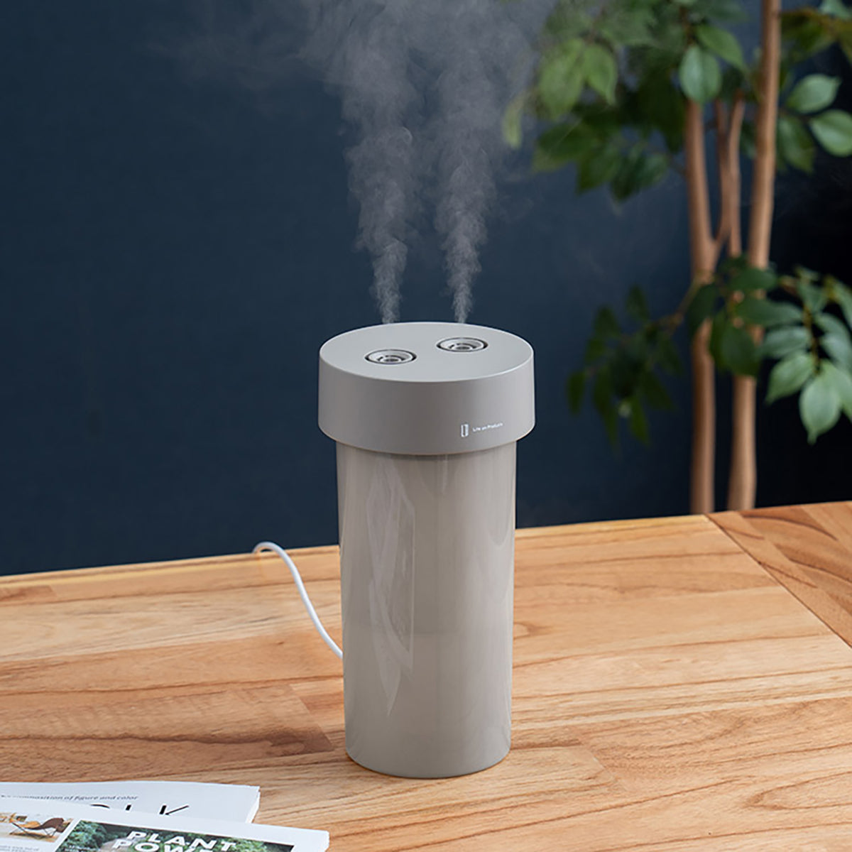ミスト噴霧は2つの噴霧口から出るデュアルミストに加え、左右交互に噴霧するシングルミストの2種類を搭載したUSB給電式ファン内蔵ツインジェット加湿器です。