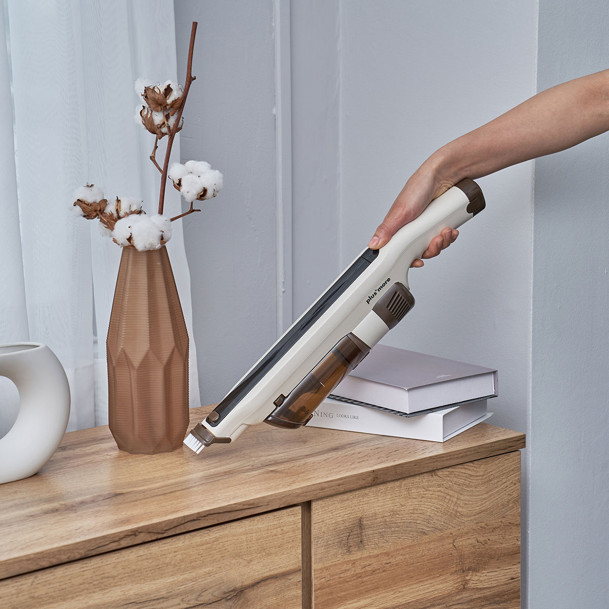 スタンド無しで自立し、掃除中でもサッと置くことができる便利なクリーナーです。