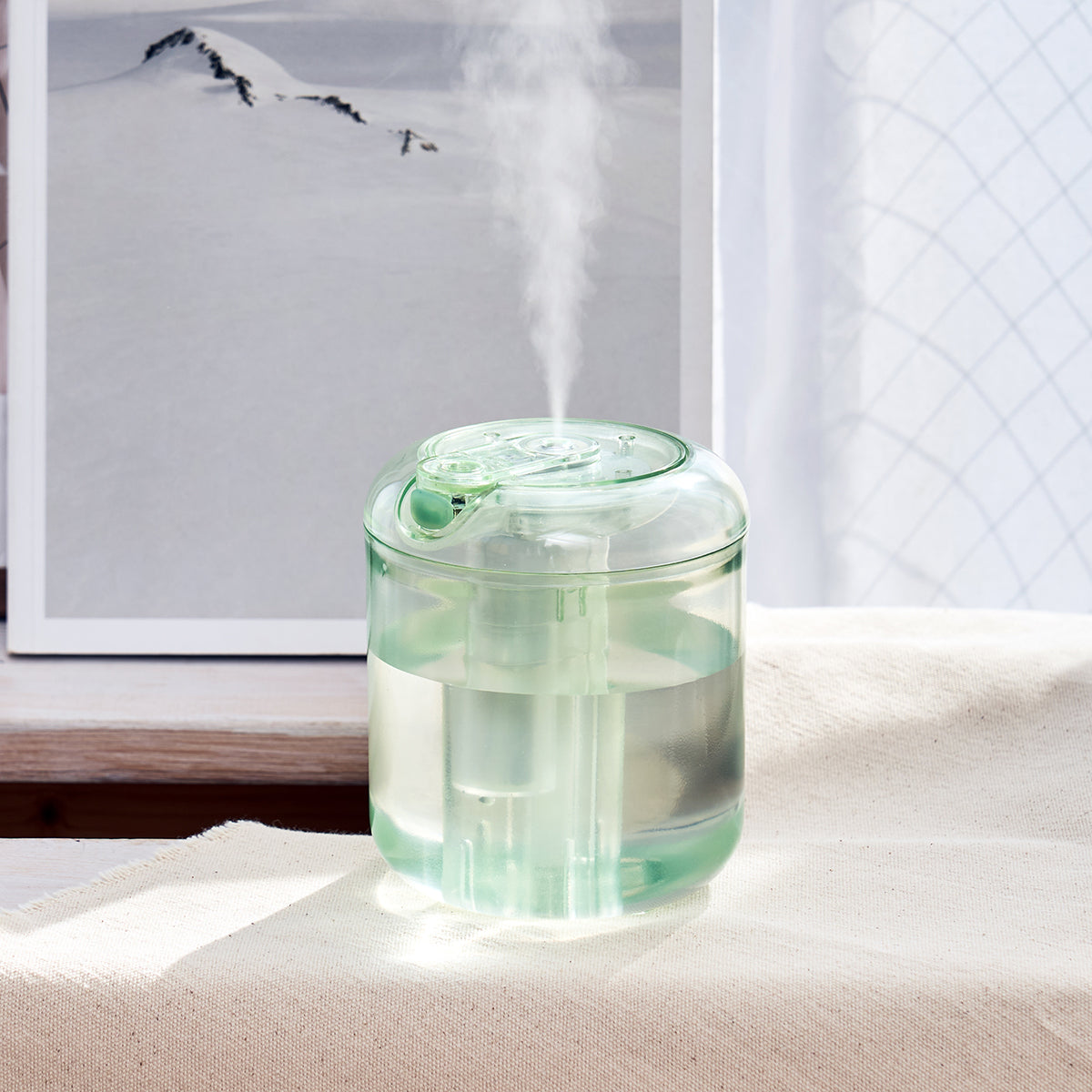 デスクで使うのにちょうどいいコンパクトサイズの充電式クリア加湿器です。