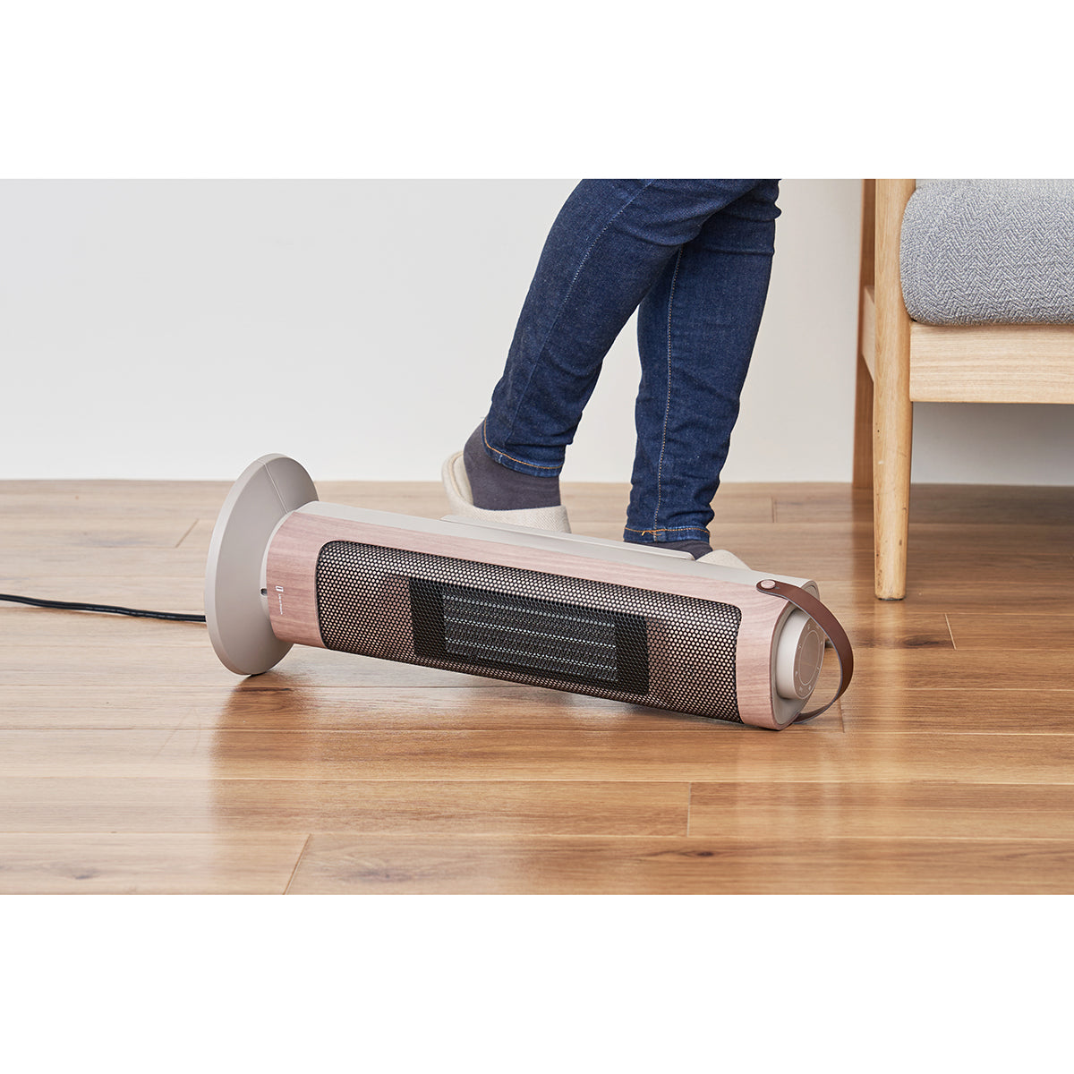 全面に美しい木目柄を配し、上部にはレザー調のハンドルをあしらったスタイリッシュなデザインのセラミックファンヒーター&ファンです。