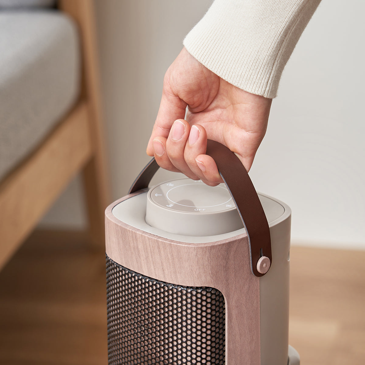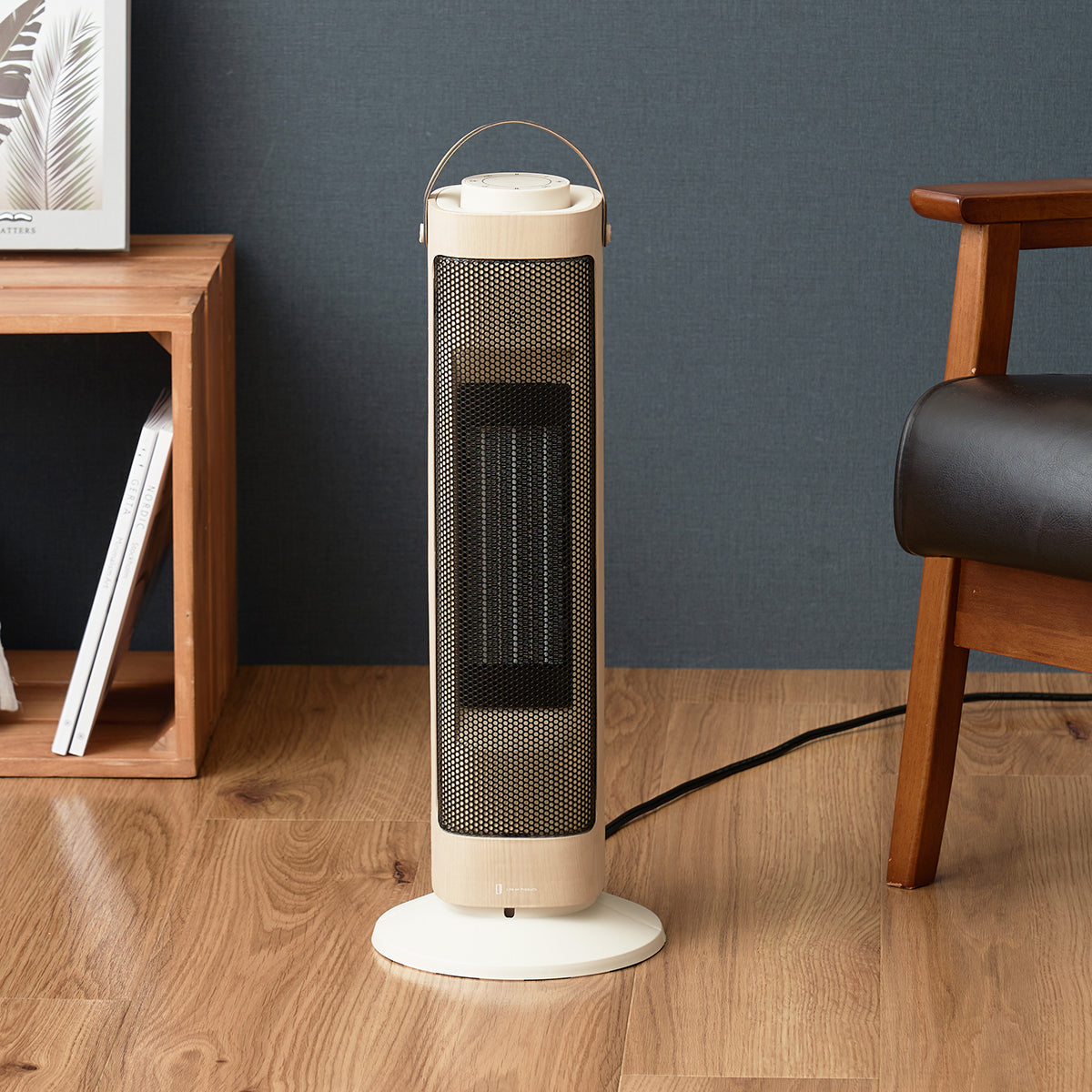 全面に美しい木目柄を配し、上部にはレザー調のハンドルをあしらったスタイリッシュなデザインのセラミックファンヒーター&ファンです。