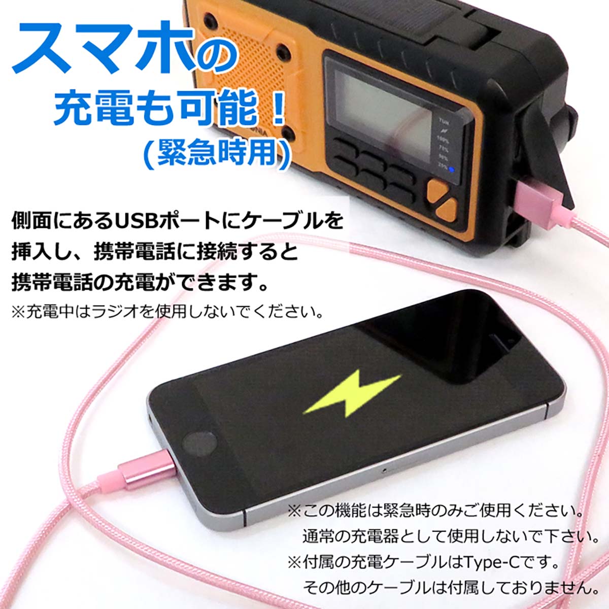 充電方法はソーラーパネル、USB、手回しの3wayから充電できます。