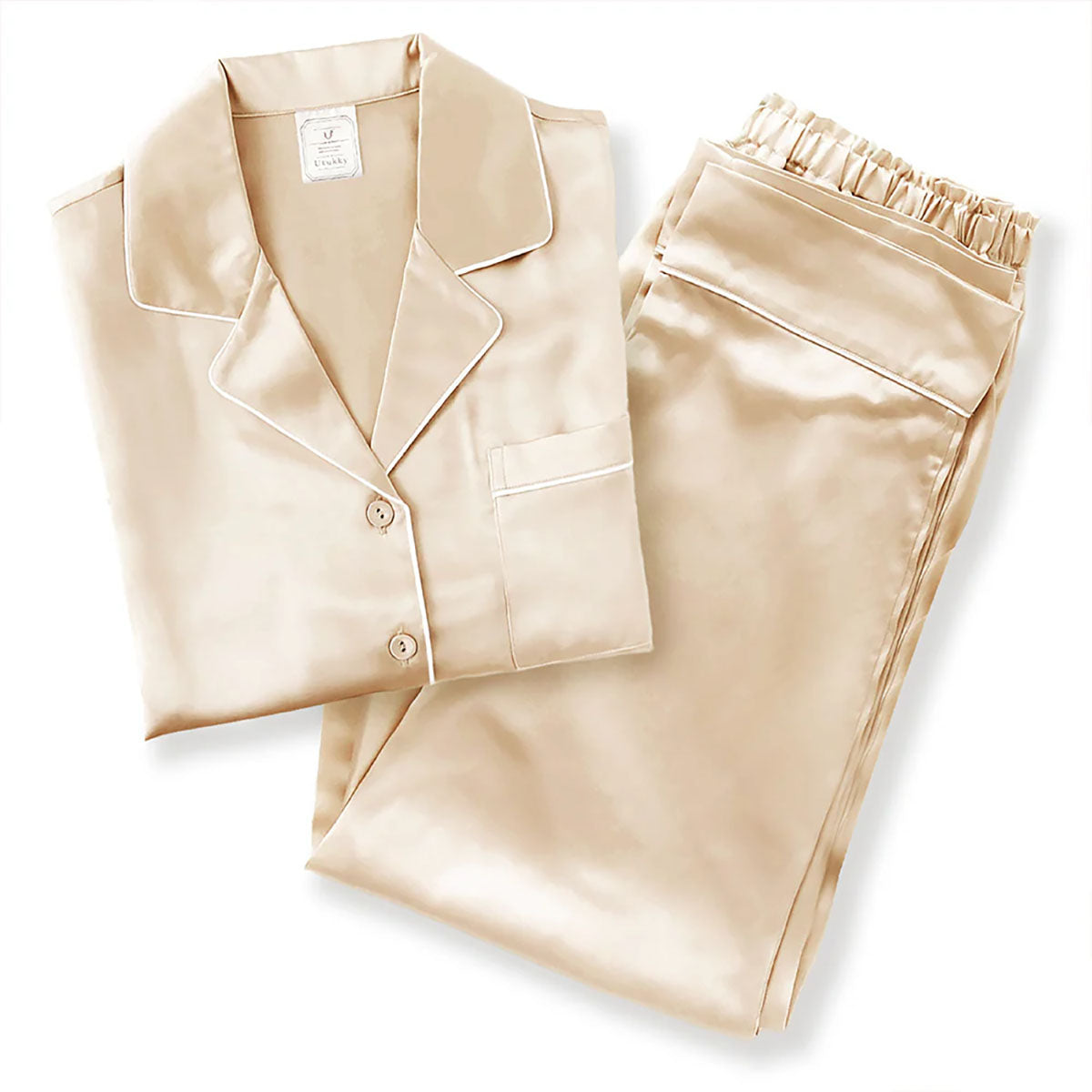シルク 長袖パジャマ 上下セット 快眠 部屋着 ナイトウェア シャンパン M/L