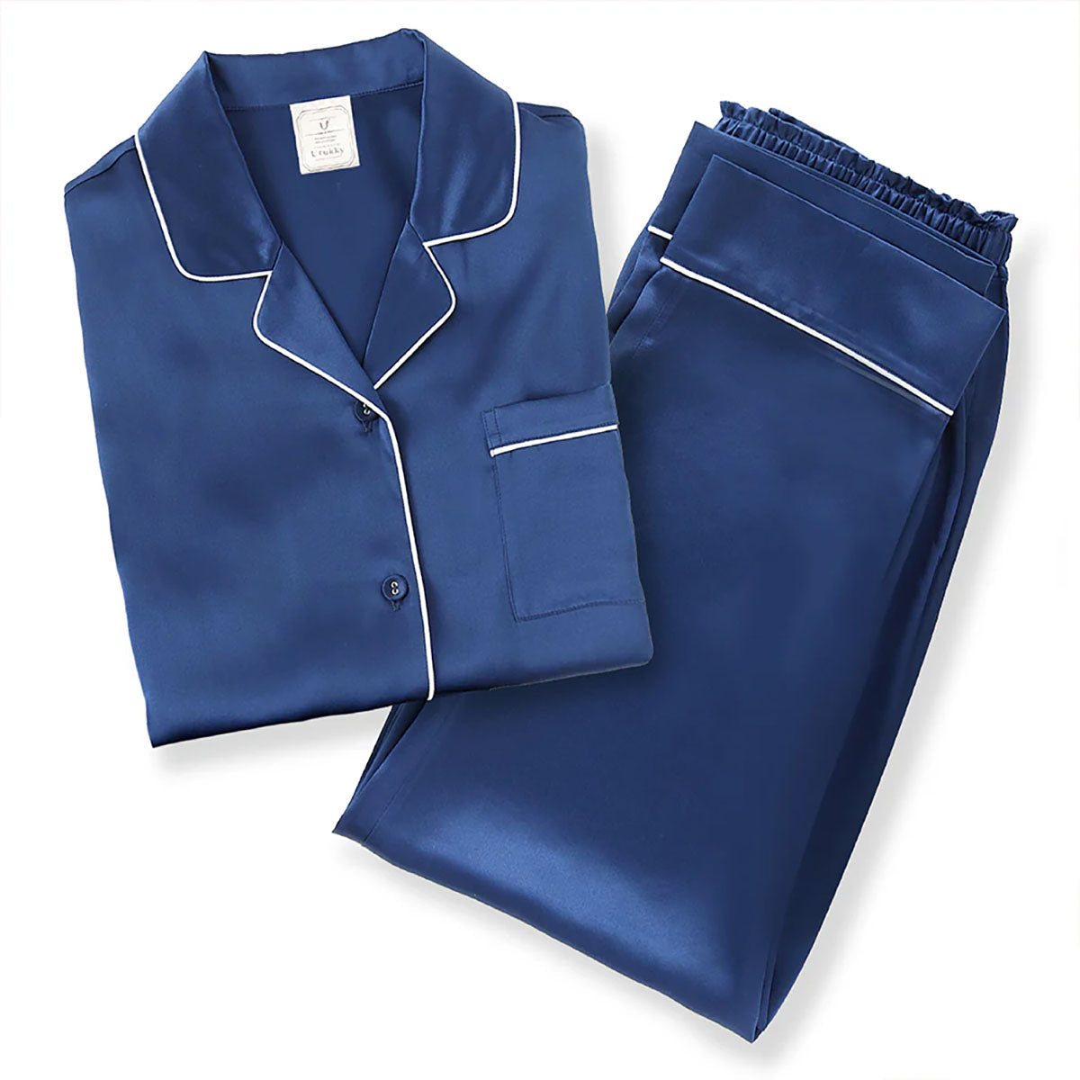 シルク 長袖パジャマ 上下セット 快眠 部屋着 ナイトウェア ネイビー M/L