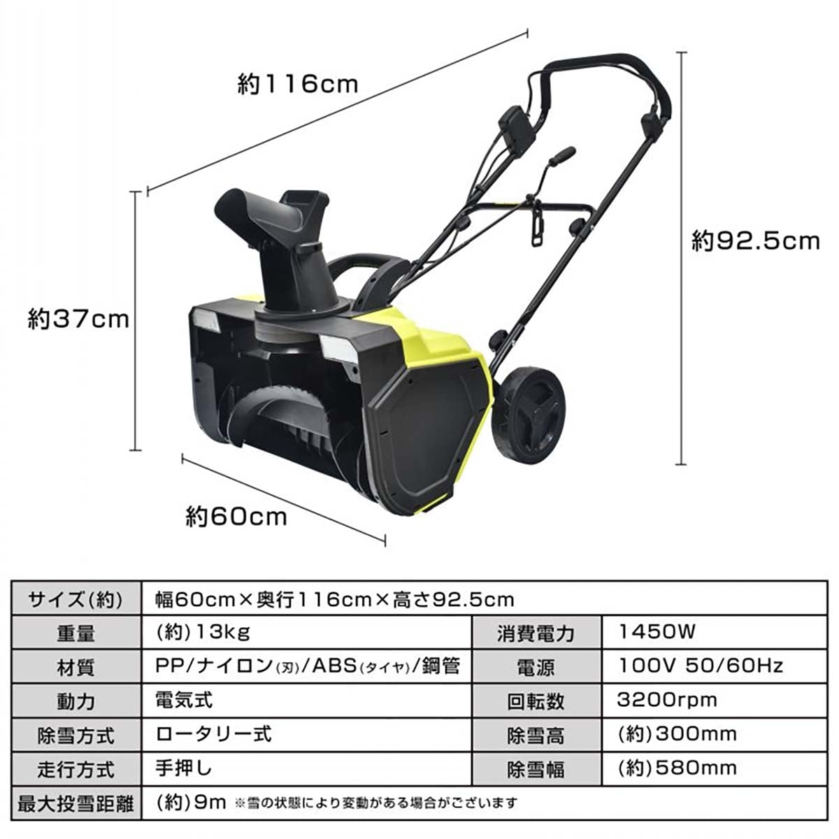 延長コードは付属していません。 市販の防雨型延長コードをご用意ください。 最大除雪距離は、雪の状態により変動がある場合がございます。 改造/本来の目的以外/強い衝撃などはお控え下さい。 仕様は改善の為に予告なく変更する場合があります。 ディスプレイ画面等の環境上、写真と実際の商品の色とは多少違う場合がございます。 海外輸入商品により、汚れ/ダメージ等がついている場合がございます。 |