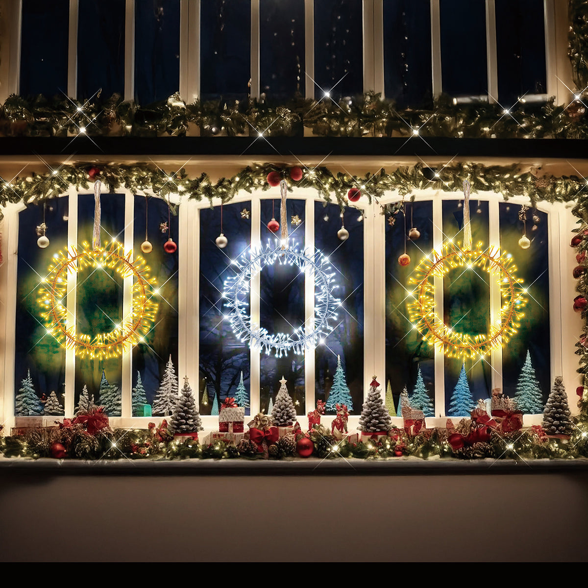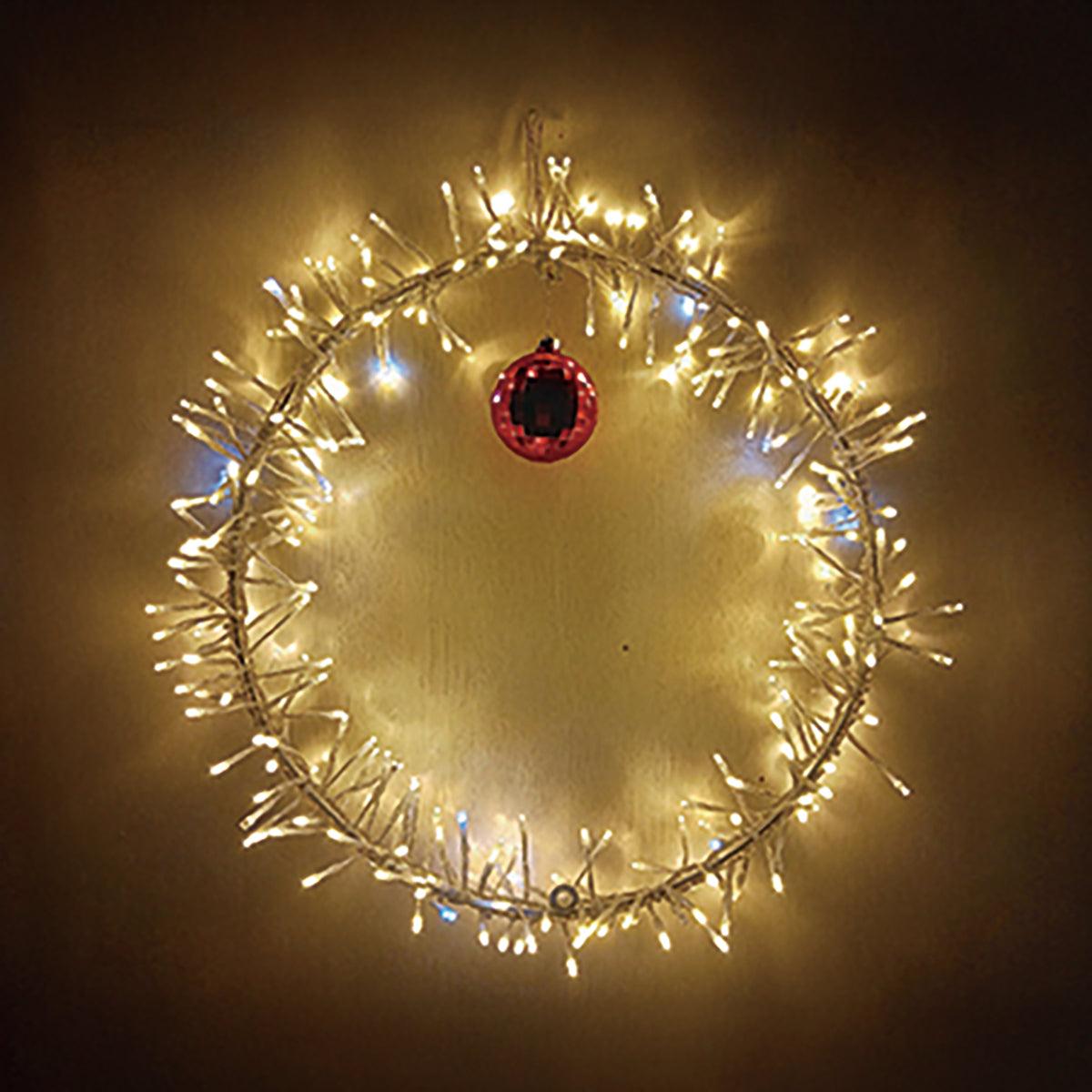 プレンティストリングライトの長い枝足で装飾されたリース型のオーナメントです。