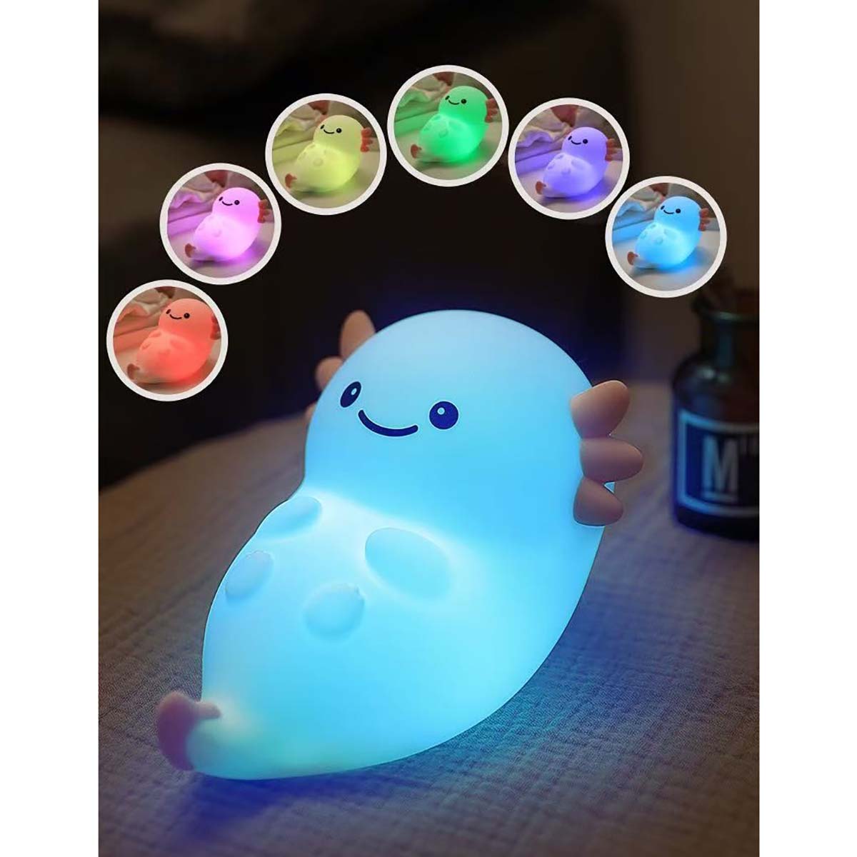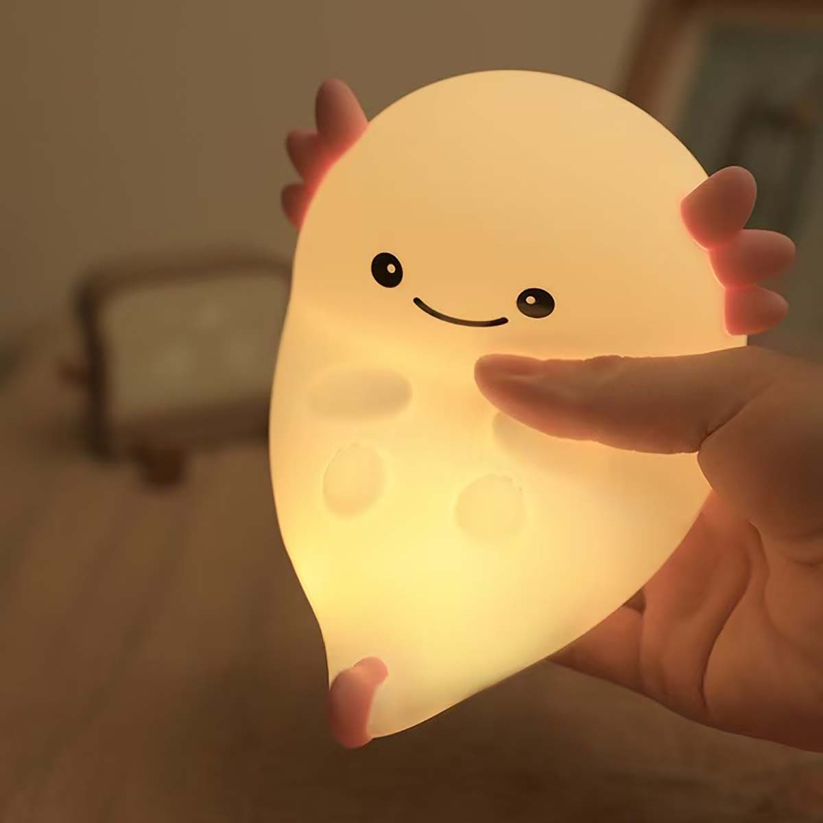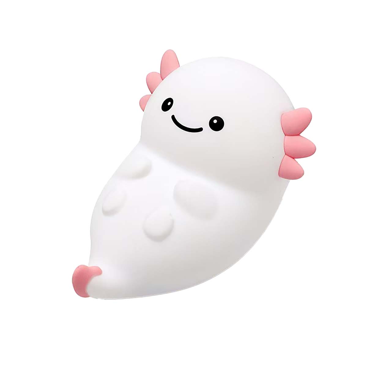 ぷっくりとしたウーパールーパーのキャラクターがやさしく光る、柔らかなシリコン素材でできたタッチ式ライトです。
