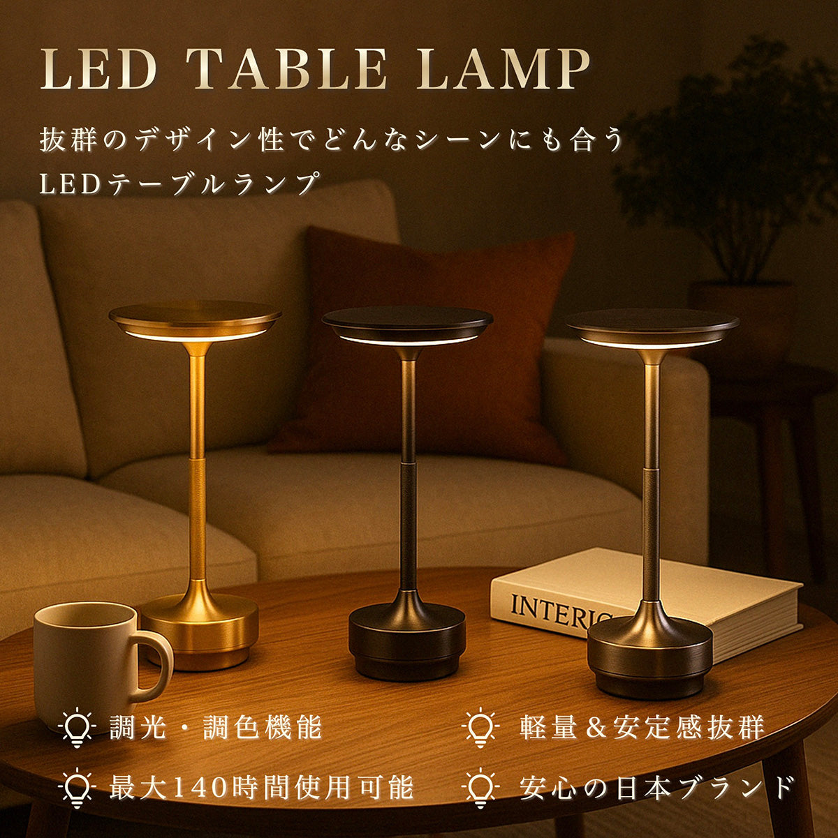 高級感のあるアルミ素材を採用し、どんなインテリアにも調和するおしゃれなテーブルランプです。