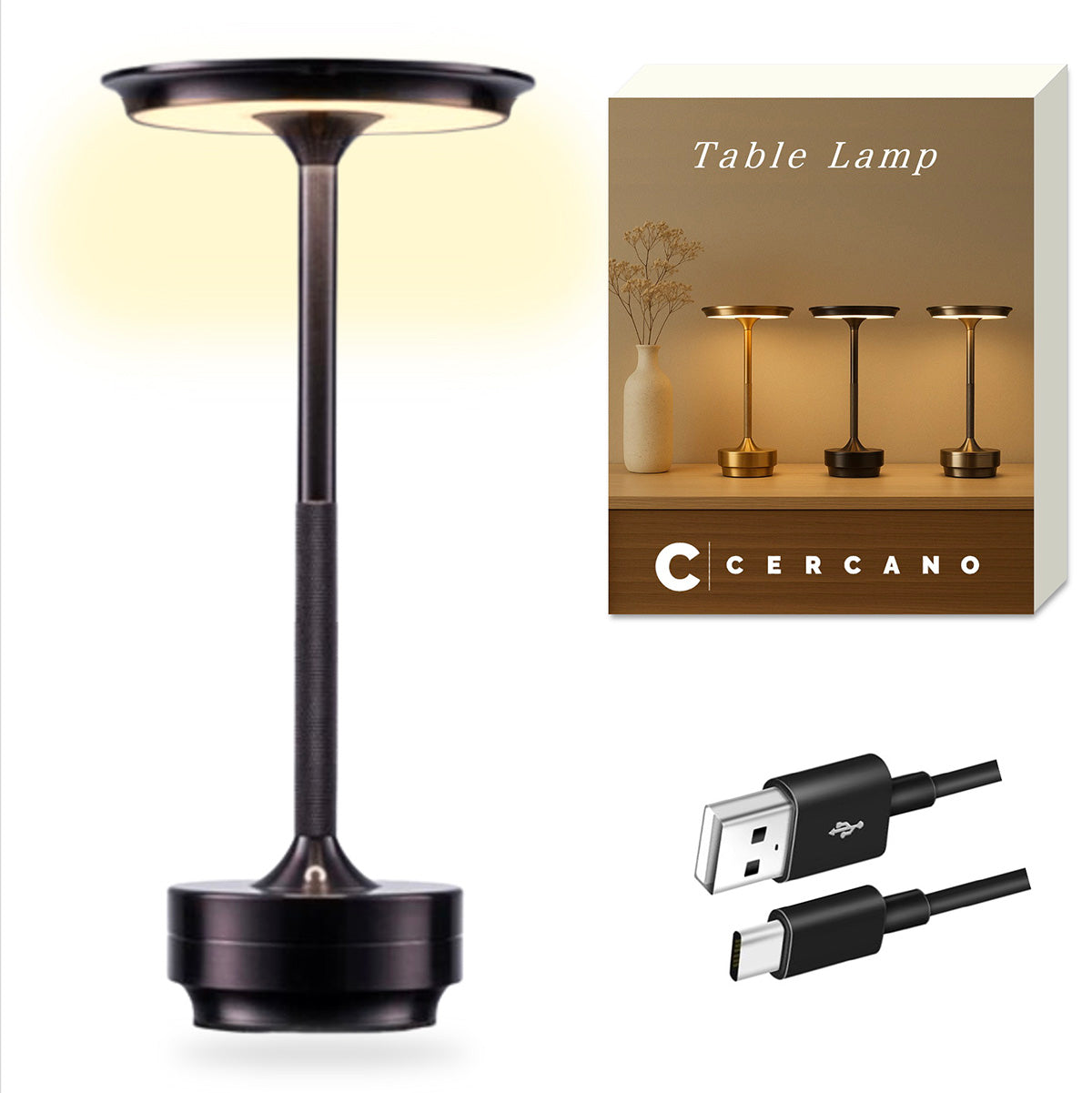 テーブルランプ 間接照明 デスクライト USB充電 おしゃれ コードレス 3色切り替え アンティーク 北欧風 LED 日本ブランド Cercano (セルカノ) (ブラック)