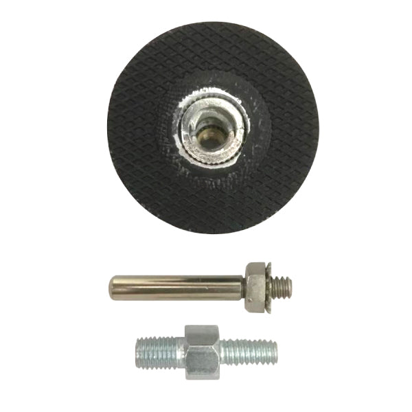 充電式ポリッシャーDS-01/エアーグラインダーセット AS-01専用パーツ、ディスクパッド台です。本製品は別売エラストマーブラシ#80 RR-01の取り付けに必要です。別売りのDS-01/AS-01専用のスピンドル取付用シャフトと市販のドリルチャック式電動工具取付用の軸径6mmシャフトの2種類を付属しています。シャフトを使用せずに直接雄ネジに装着することもできます。