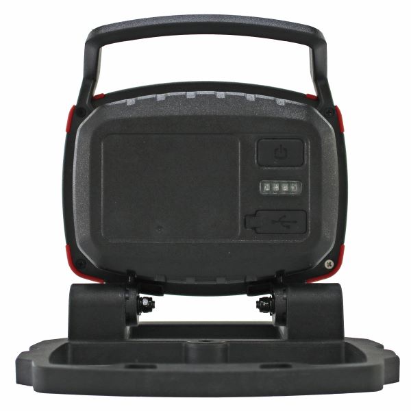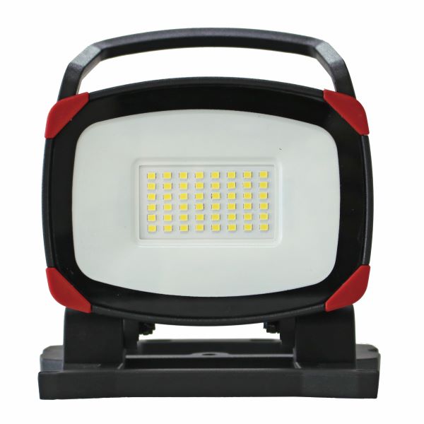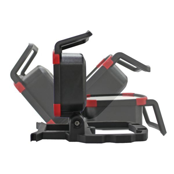 下向きを含む幅広い角度に調整可能なLED仕様の充電式ワークライトです。ガラス繊維強化樹脂ボディで衝撃に強く、最大光束1800ルーメンです。便利な壁掛け仕様、コンパクトに使える薄型設計で便利です。実用新案登録済みです。