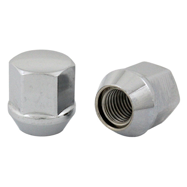 軽自動車、コンパクトカーに適しているタイヤホイール用の袋ナットです。別名化粧ナット、一般的な六角ナットの片面が閉じており、ネジ穴が貫通していない六角ナットです。ボルトのおねじ先端部が現れないように、片面を帽子状にしたナットです。締めつけられる物体内部の流体がもれにくくなって耐密性となり、おねじ先端部が見えないため装飾効果もあります。