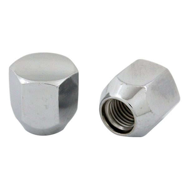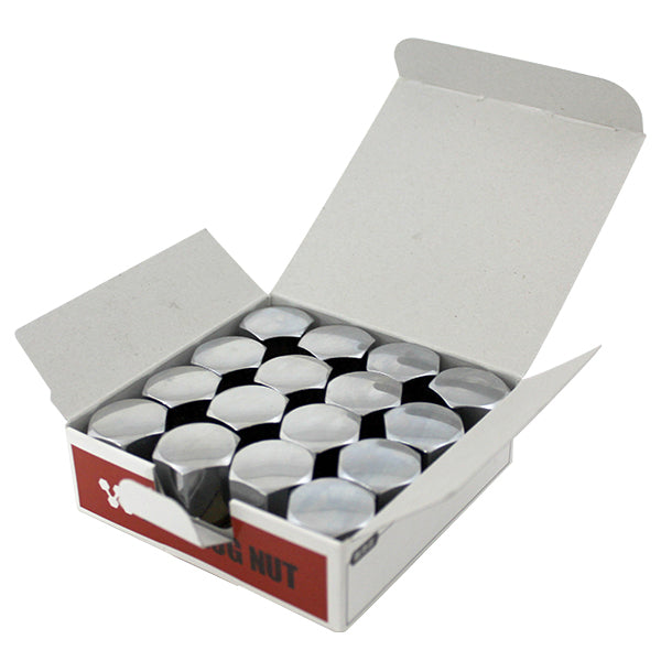 軽自動車、コンパクトカーに適しているタイヤホイール用の袋ナットです。別名化粧ナット、一般的な六角ナットの片面が閉じており、ネジ穴が貫通していない六角ナットです。ボルトのおねじ先端部が現れないように、片面を帽子状にしたナットです。締めつけられる物体内部の流体がもれにくくなって耐密性となり、おねじ先端部が見えないため装飾効果もあります。