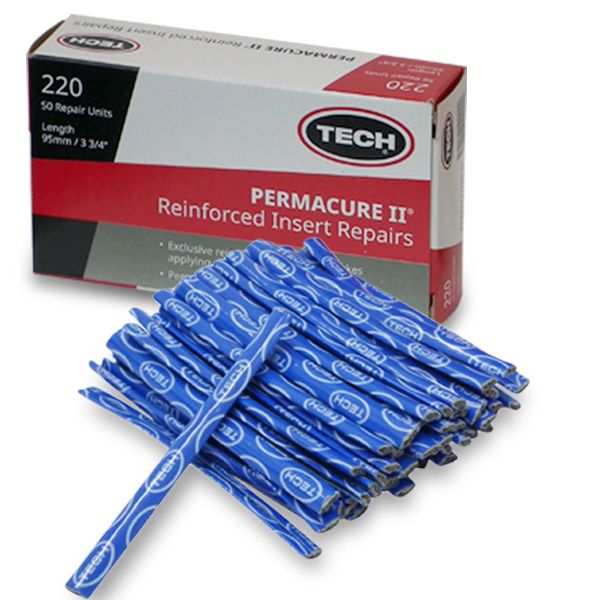 チューブレスタイヤのパンク修理用シールストリング、TECH加硫セメントと併せて使用します。外面釘穴の補修に最適です。テックパーマキュアは特殊繊維のフィラメントで強化され切れにくくなっています。