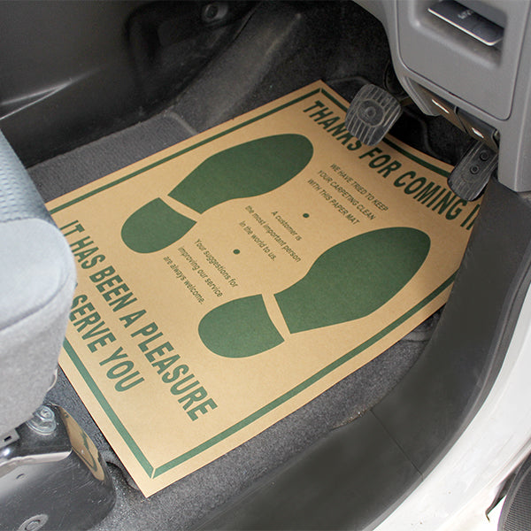 大事なお客様への納車時に活躍、環境にやさしいペーパータイプです。自動車整備、販売、展示車用フロアマット汚れ防止用マットです。1枚1枚カットされているので使いやすい。