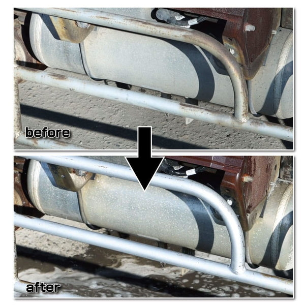 アルミ・ステンレスのサビ落としです。トラックに付着したサビ・水アカなどの汚れを強力な酸の力で徹底除去します。水産系・畜産系に多くみられる金属表面に付着した頑固な水垢や塩分による白ボケ・サビなどを強力に落とします。