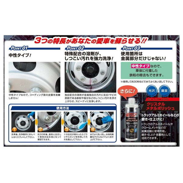 トラックのアルミ・ステンレス・スチールパーツのクリーニングにおすすめです。化学反応をおこしてサビの原因である鉄粉・塩分を強力洗浄します。