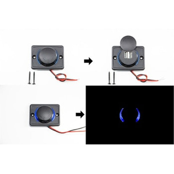 | 取付け方法取り付ける位置を決めてボルトで固定。配線を通す穴(5mm程度)を設ける必要あり。※取り付けには取り付け箇所の加工が必要となります。ご注意ください。※2.4Aを超える使用は不可(例3.0A急速充電器など)※接続される機器の使用注意事項をご確認のうえご使用下さい。※本製品の使用による接続機器の損傷、内部データの破損や消失に関する責任は一切負いかねます。※本製品の使用時にオーディオなどにノイズが発生する場合があります。 |